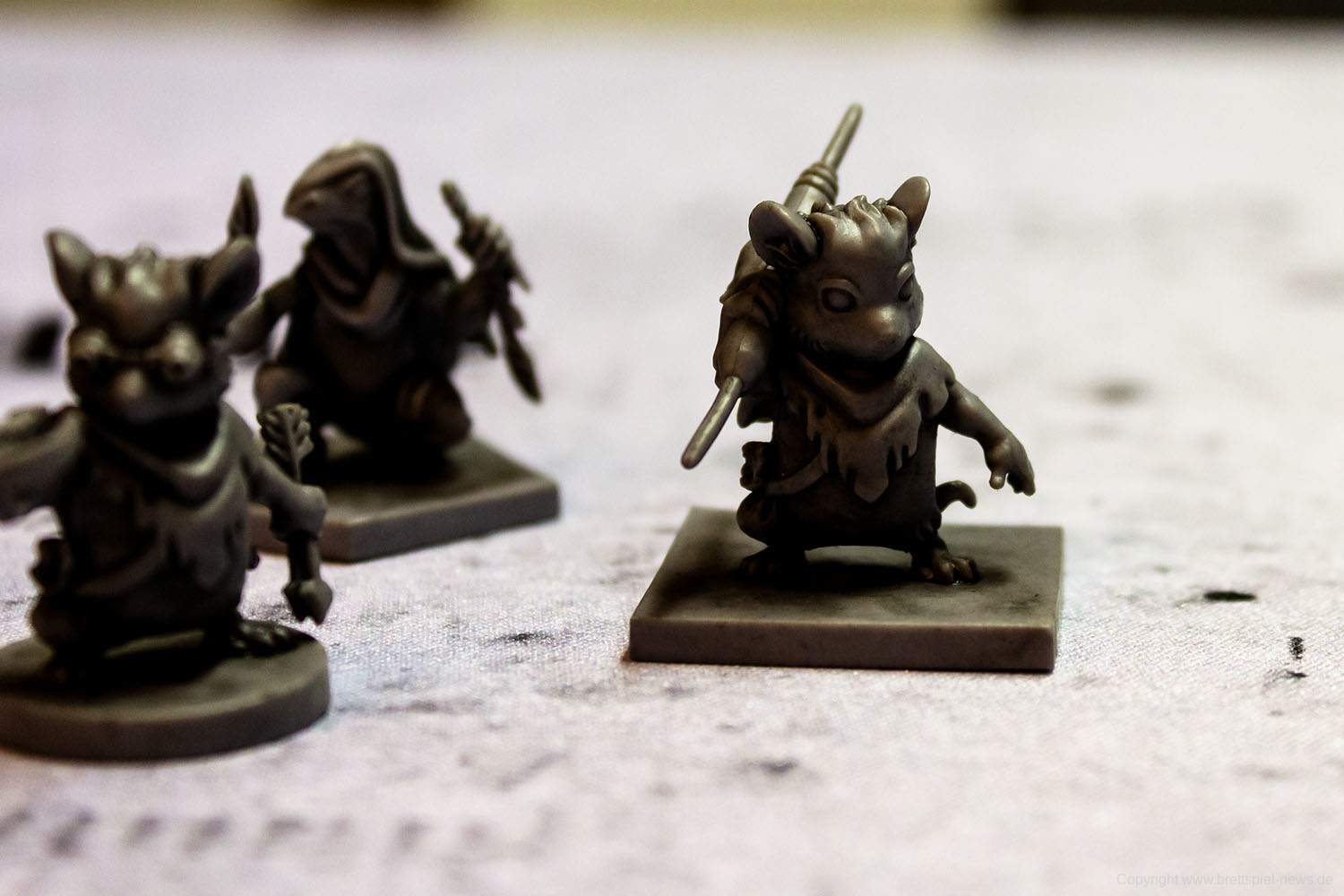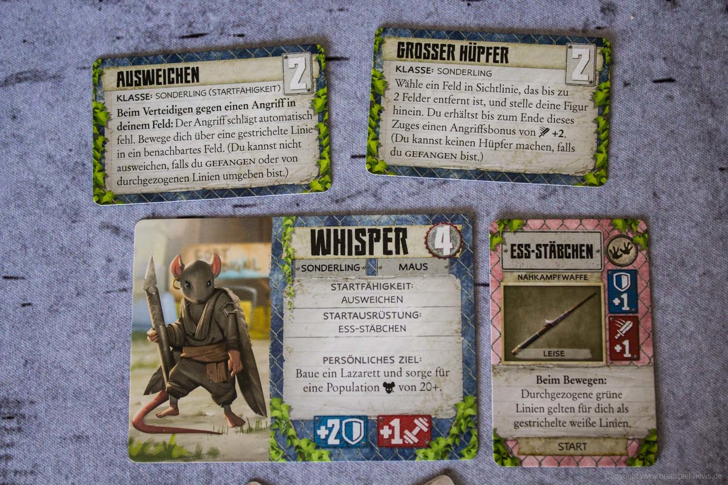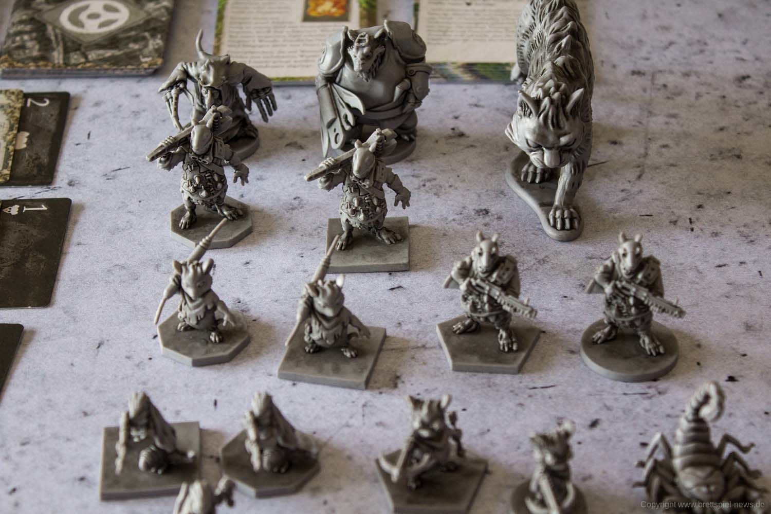 Wer die PLAID HAT GAMES-Abenteuerbuchspiele kennt, der wird gleich zu Beginn bemerken, dass der große Beutel mit Würfeln fehlt. Hat bislang das Ziehen von Würfeln über das Schicksal für den Zug entschieden, ist man nun auf das Wohl beim Ziehen von Karten angewiesen. Die Mechanik hat mir persönlich deutlich besser gefallen, inkl. dem Auslegen der Bedrohungskarten, über die am Ende auch die Aktionen der Gegner im Kampf gesteuert werden. Der Kampf an sich hat dabei allerdings nicht sonderlich an Komplexität gewonnen. Wie gewohnt ist es möglich, auch ohne entsprechende Waffe einen Fernkampf auszulösen bzw. bei fehlenden Karten ist es gar nicht möglich. Wichtig ist weiterhin, wo auf dem Spielfeld die eigene Miniatur abgestellt wird, da es auf ein und demselben Feld eine Sichtlinie zu einem Gegner geben kann oder aber auch nicht. Taktisch bleibt das Spiel somit recht überschaubar. Die gesamte Kampfmechanik ist wie gehabt nicht sonderlich anspruchsvoll, bietet nur wenig taktische Möglichkeiten und kann bestenfalls als solide bezeichnet werden.