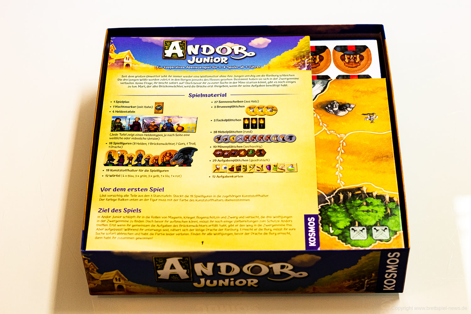 ANDOR JUNIOR wird in der klassischen Kosmos Schachtelgröße ausgeliefert. Das Spiel hätte aber auch locker in einer kleineren Box seinen Platz gefunden. Die verschiedenfarbigen W6 sind mit silberner Farbe bedruckt, die Missionskarten aus etwas festerem Karton gefertigt und auch das restliche Spielmaterial dürfte viele Spielpartien überstehen. Da der UVP auch nur bei 30 € liegt, ist die Ausstattung voll in Ordnung. Wer ein Sparfuchs ist, kann aber noch etwas warten.