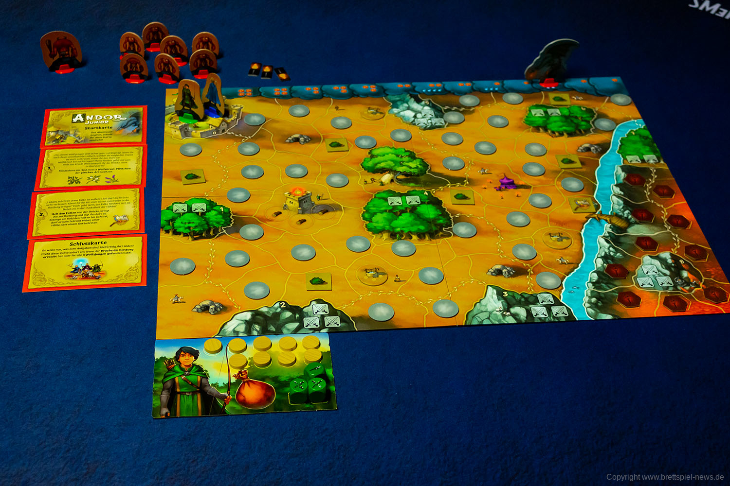 ANDOR JUNIOR hat immer die gleiche Aufgabe: Rette drei Wolfsjungen, die sich in der Zwergen Mine verirrt haben. Das Spielfeld besteht aus zwei Zonen: Die erste größere ist vom Start weg begehbar, die zweite Zone, in der die Wolfsjungen gerettet werden sollen, ist erst nach Abschluss aller Aufgaben zu betreten. Die Aufgaben sind variabel, weil aus einem Pool von 10 Karten ausgewählt werden kann.