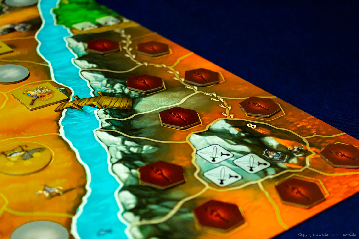 - Nebelfeld // Betritt ein Held ein Feld, auf dem ein Nebelfeld ausliegt, muss er dieses umdrehen und die angezeigte Aktion ausführen. Teilweise können die Helden hier auch nützliche Objekte finden. Es warten Schwerter, Gold, Holz und anderes unter den Plättchen, aber auch die Gors und Drachen, die Andor bedrohen. Die Gors werden auf einer speziellen Leiste positioniert und wandern in der Nacht immer weiter Richtung Rietburg. Der Drache hingegen ist auf der Drachenleiste positioniert und bewegt sich nach und nach in Richtung der Burg und steigert damit die Anzahl von Gors, die in jeder weiteren Runde ins Spiel kommen.