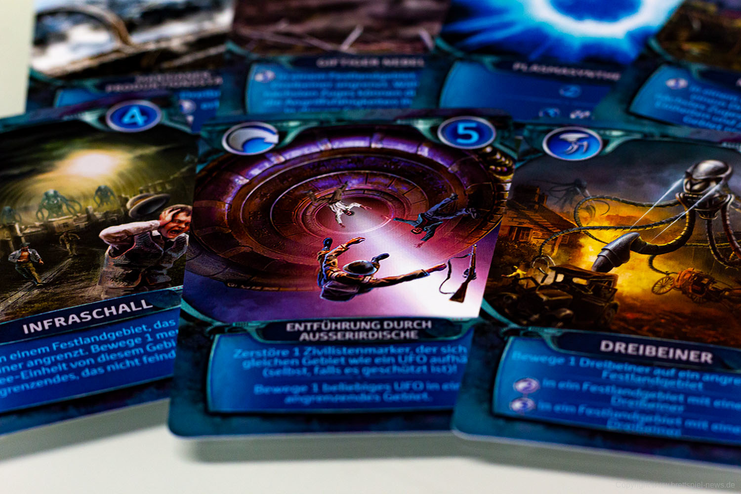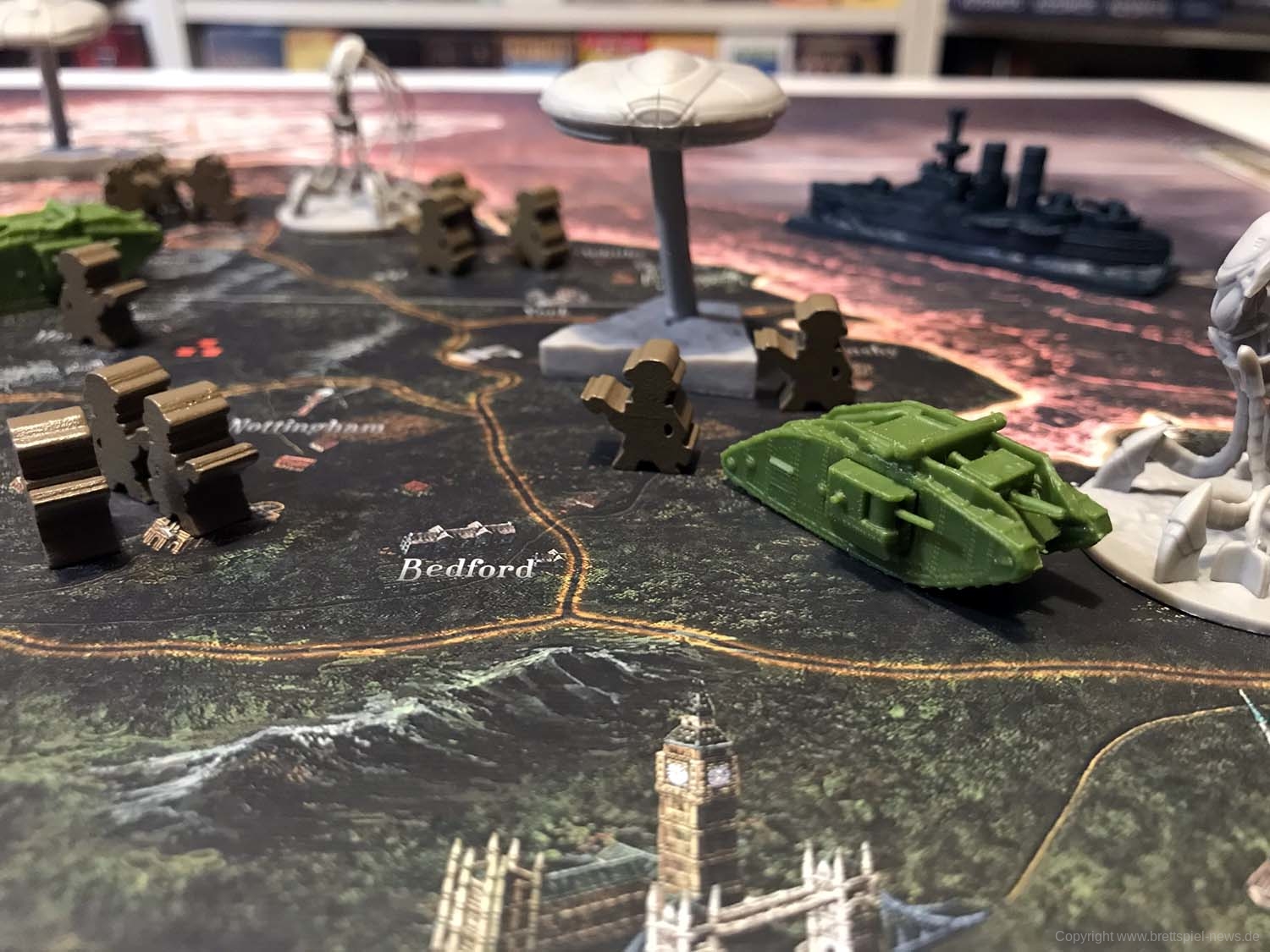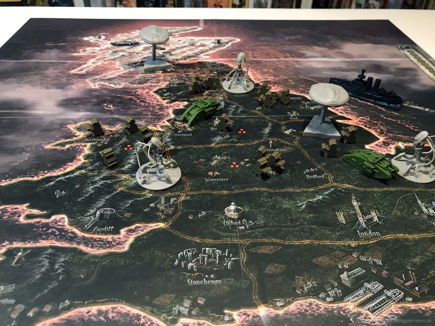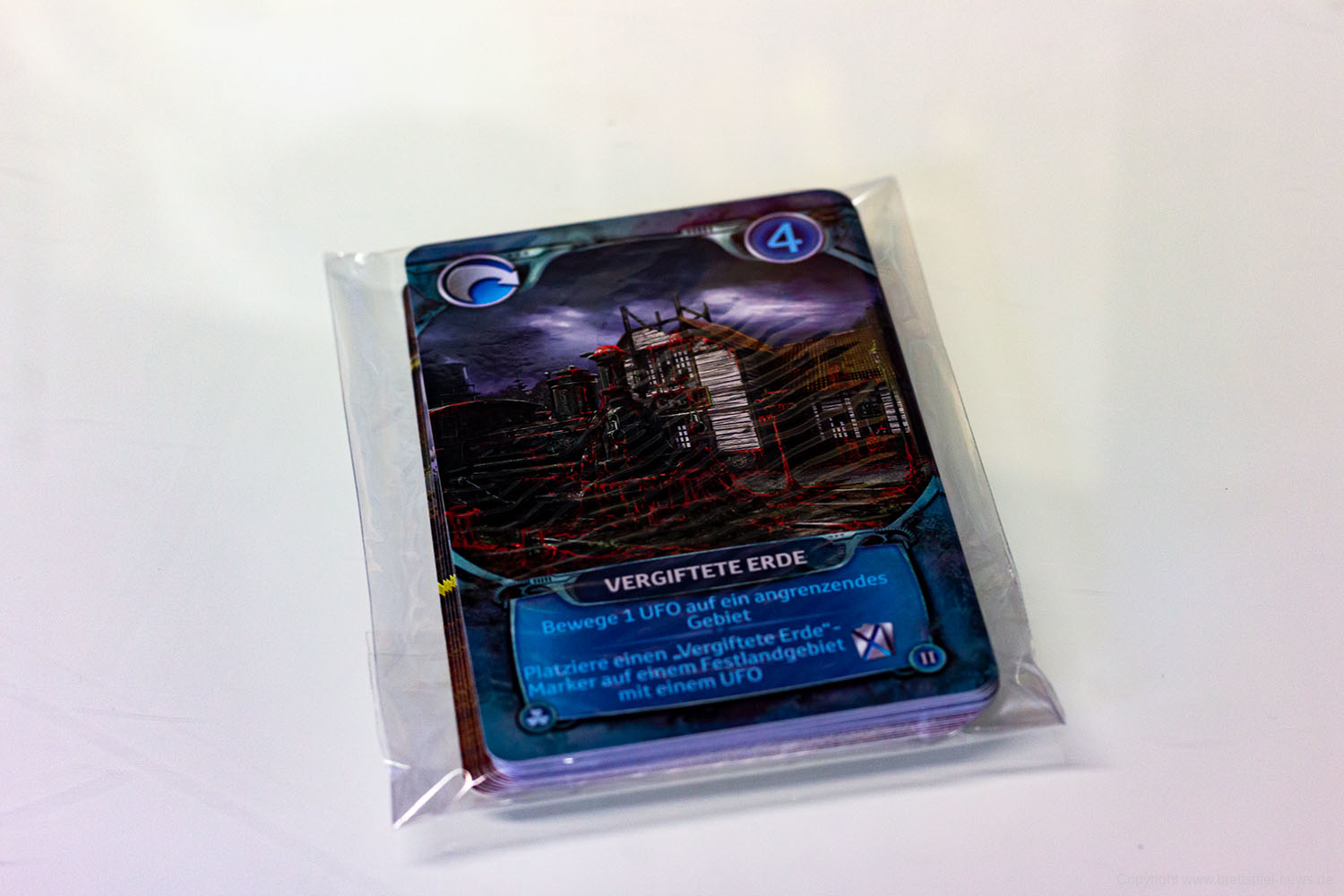 Dieses Muster wird durch die Erweiterung zumindest ein wenig aufgebrochen, da die Menschen nunmehr die Möglichkeit haben, die UFOs der Aliens anzugreifen. Das halten wir zugleich auch für den besten Aspekt der Erweiterung. Das genügt alleine jedoch nicht, um ein „Gamechanger“ zu sein. Der zusätzliche Irland-Spielplan war für uns leider uninteressant und konnte aus unserer Sicht keinen Mehrwert beitragen. Dafür hätte es etwas mehr sein müssen als nur drei neue Gebiete auf der anderen Seite des Gewässers.