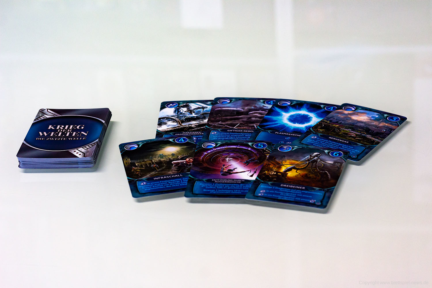 KRIEG DER WELTEN – DIE ZWEITE WELLE lässt uns im Zwiespalt zurück. Auch wenn wir keine großen Fans von Deckbuilding-Mechanismen sind, gefällt uns die Verbindung mit der enthalten Area Control-Mechanik. Uns hat auch die Atmosphäre im Spiel gefallen, denn DENNIS PLASTININ, dem Autor des Spiels, ist es tatsächlich gelungen, die Atmosphäre der literarischen Vorlage einzufangen und dem menschlichen Spieler das ständige Gefühl des Bedrohtseins zu vermitteln. Zudem kann die für Spiele dieses Genres eher untypisch kurze Spieldauer von 45 bis 60 Minuten pro Partie überzeugen, denn nach der ersten Partie kann man sofort die Fraktionen wechseln und ein Revanche-Match spielen. Dem guten Spielfluss tragen auch die einfachen und schnell erlernten Regeln Rechnung.