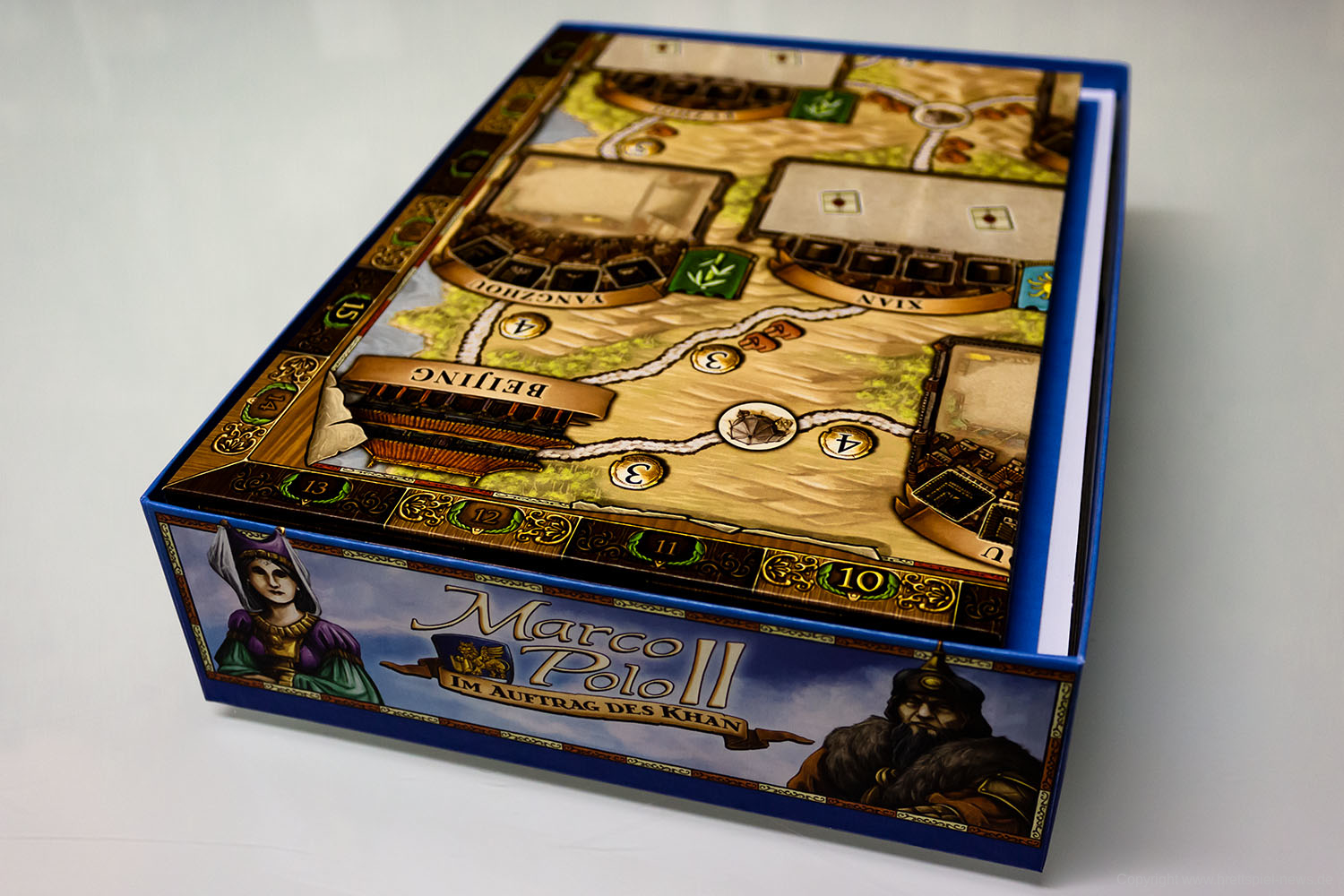 Bei MARCO POLO II handelt es sich um ein Spiel mit der für HANS IM GLÜCK typischen Materialqualität und einer umfangreichen Ausstattung. Das bedeutet, dass sich die Spieler auf Tableaus, Plättchen und Spielpläne aus dicker Pappe und jede Menge Holzmarker freuen dürfen. Lediglich der Karton der Spieleschachtel ist mir wie bei anderen Spielen des Verlags etwas zu dünn geraten.