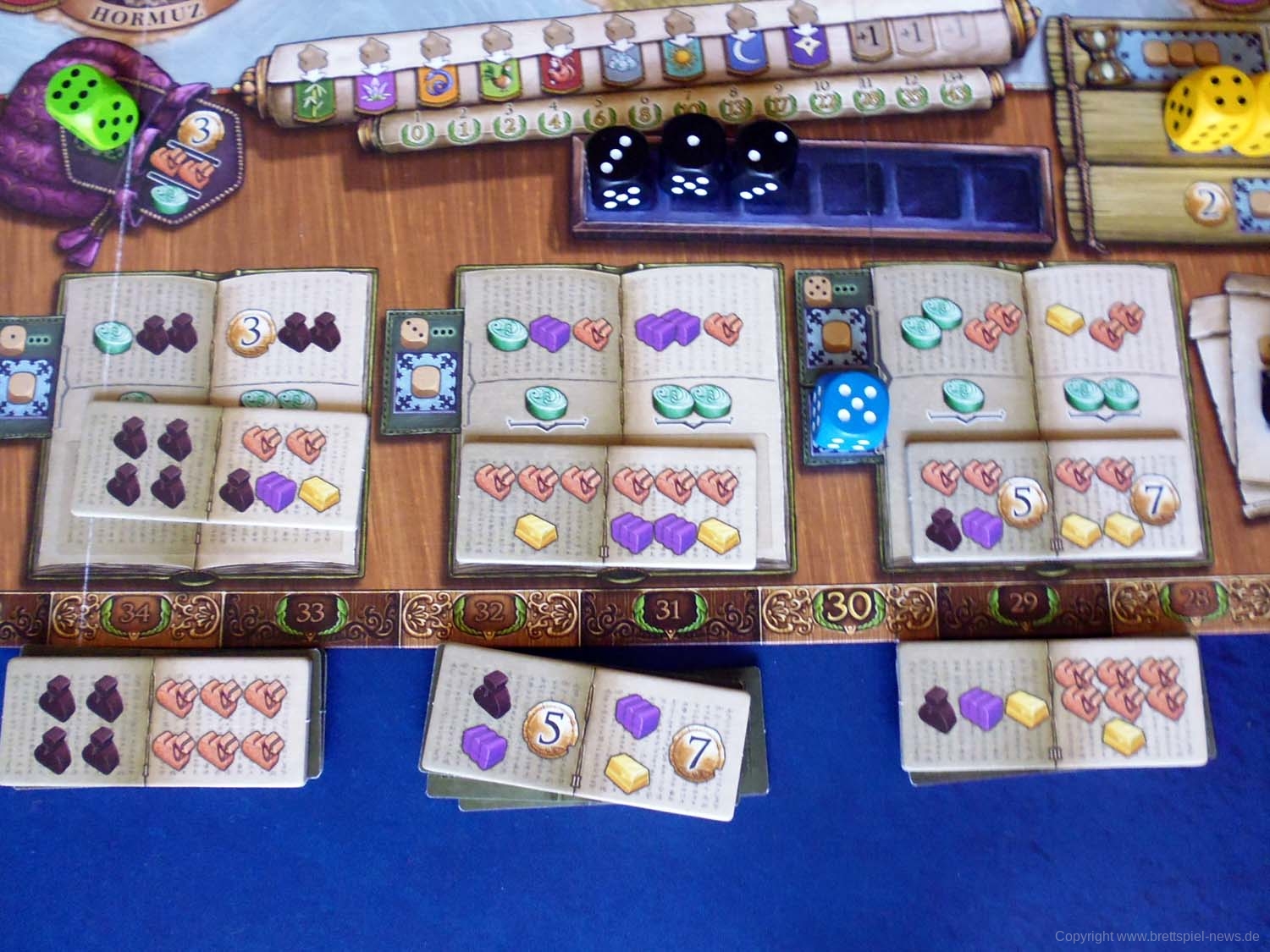 Neben den Würfeln müssen die Spieler vor Antritt der Reise alle zu bezahlenden Rohstoffe und die entsprechende Menge an Geld abgeben.