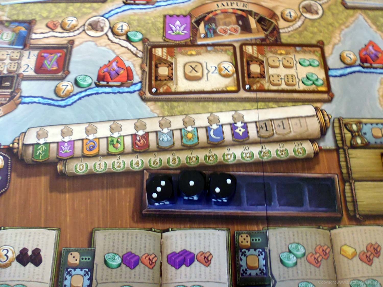 Der Spielplan ist wiederum deutlich überladen, was nicht zuletzt an den abgedruckten Reisekosten auf den einzelnen Routen liegt. Hier wäre es sicher besser gewesen, die übrigen Aktionsfelder auf ein Tableau auszulagern. Dafür ist die klare Symbolik bereits nach einer Partie verinnerlicht, wodurch Nachfragen meist ausbleiben.
