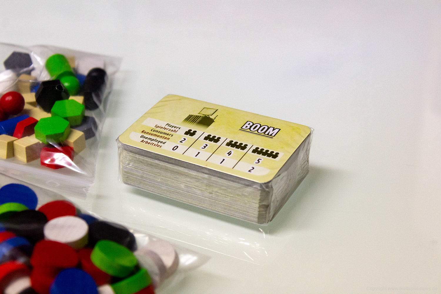 Zuletzt wird der Stapel mit den Konjunkturprognose-Karten auf den Stapel „zukünftig“ und die oberste Karte verdeckt auf „aktuell“ ausgelegt. Es gibt die Konjunkturphasen Depression, Rezession, Stabil und Boom. Die Rückseite gibt bereits eine Spanne an, mit wie viel Nachfrage in dieser und der nächsten Runde zu rechnen ist und wie sich der Arbeitsmarkt entwickeln wird.