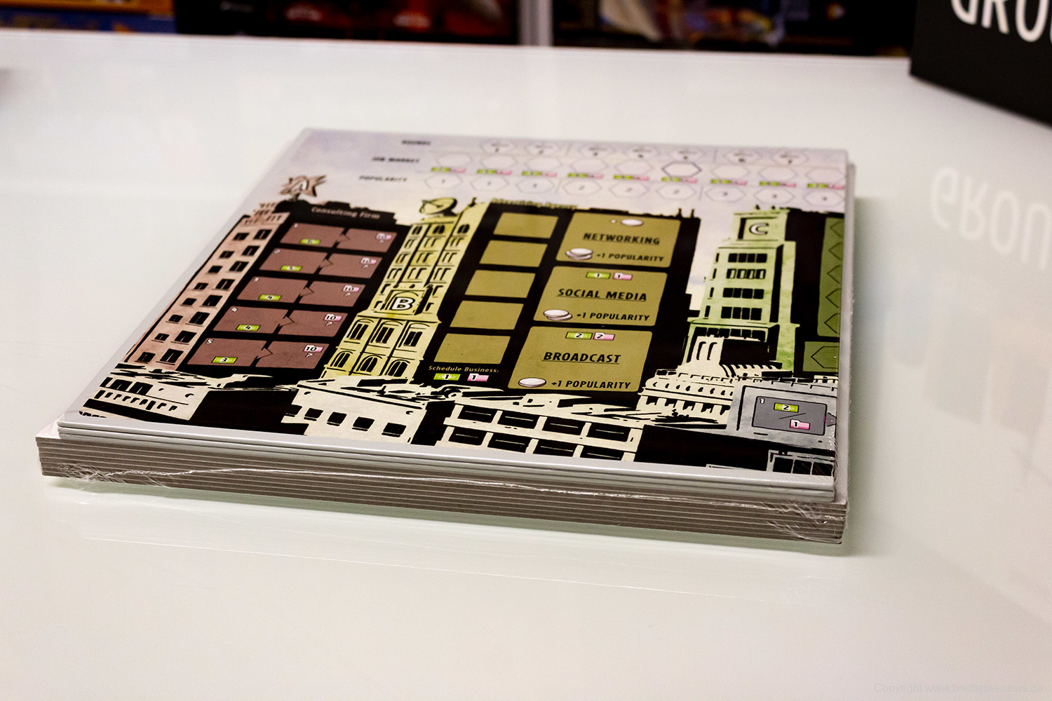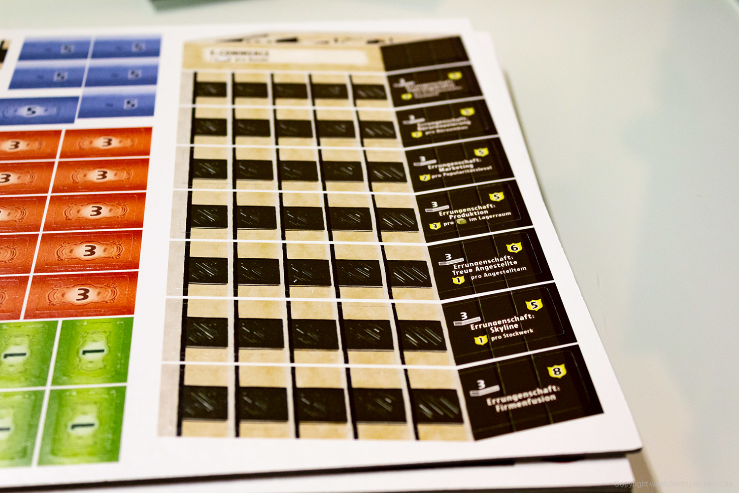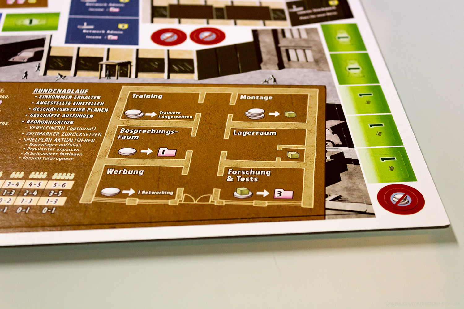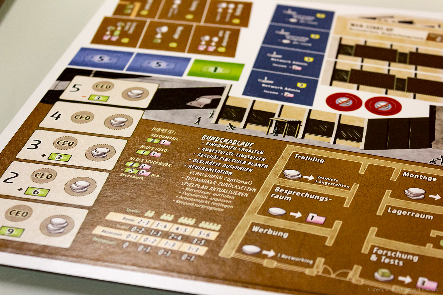 Jeder CEO (Chief Executive Officer => der Chef) erhält zu Spielbeginn sein Spielertableau, welches das eigene Firmengebäude und die Arbeiterleiste zeigt. Zuist unsere Firma allerdings nur ein wenig beeindruckendes einstöckiges Gebäude mit ein paar Büroräumen im Erdgeschoss und außer uns selbst gibt es auch noch keine Mitarbeiter.