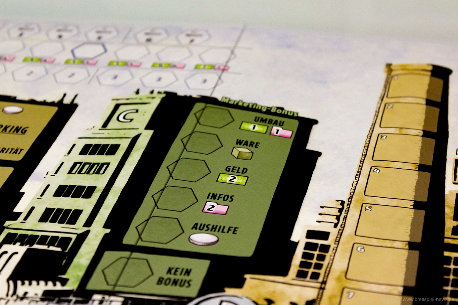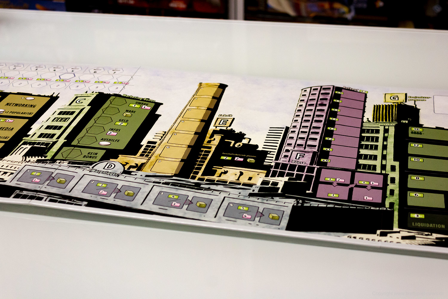 Jeder CEO zieht zufällig eine Spezialisierung für sein Unternehmen, dargestellt durch das Dach des Gebäudes, so dass alle Spieler mit einem anderen Vorteil starten. Ein Einzelhandel z.B. erlaubt sofort den Umbau des Warenlagers und dadurch die Lagerung von zwei Warensteinen.