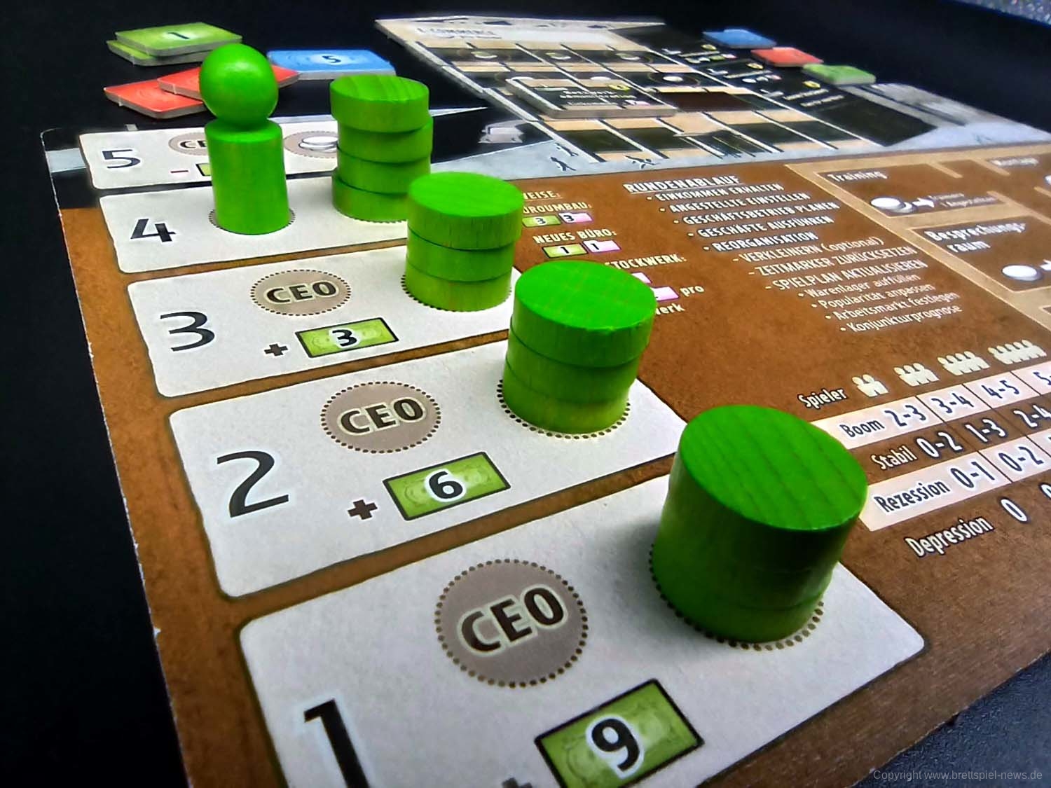 Nun kann das Spiel beginnen und alle CEOs erhalten Einkommen, das sich nach der Anzahl ihrer Mitarbeiter richtet. Zu Beginn ohne weitere Mitarbeiter ist dies neun Geld. Im Anschluss dürfen die Spieler Arbeiter entsprechend der Kosten auf der Leiste einstellen. Je neu eingestelltem Mitarbeiter wird der Marker auf der entsprechenden Kostenleiste um eins erhöht. Bevor Arbeiter allerdings zusätzliche Zeitscheiben bereit stellen, müssen diese erst noch in einem der Büros trainiert werden.