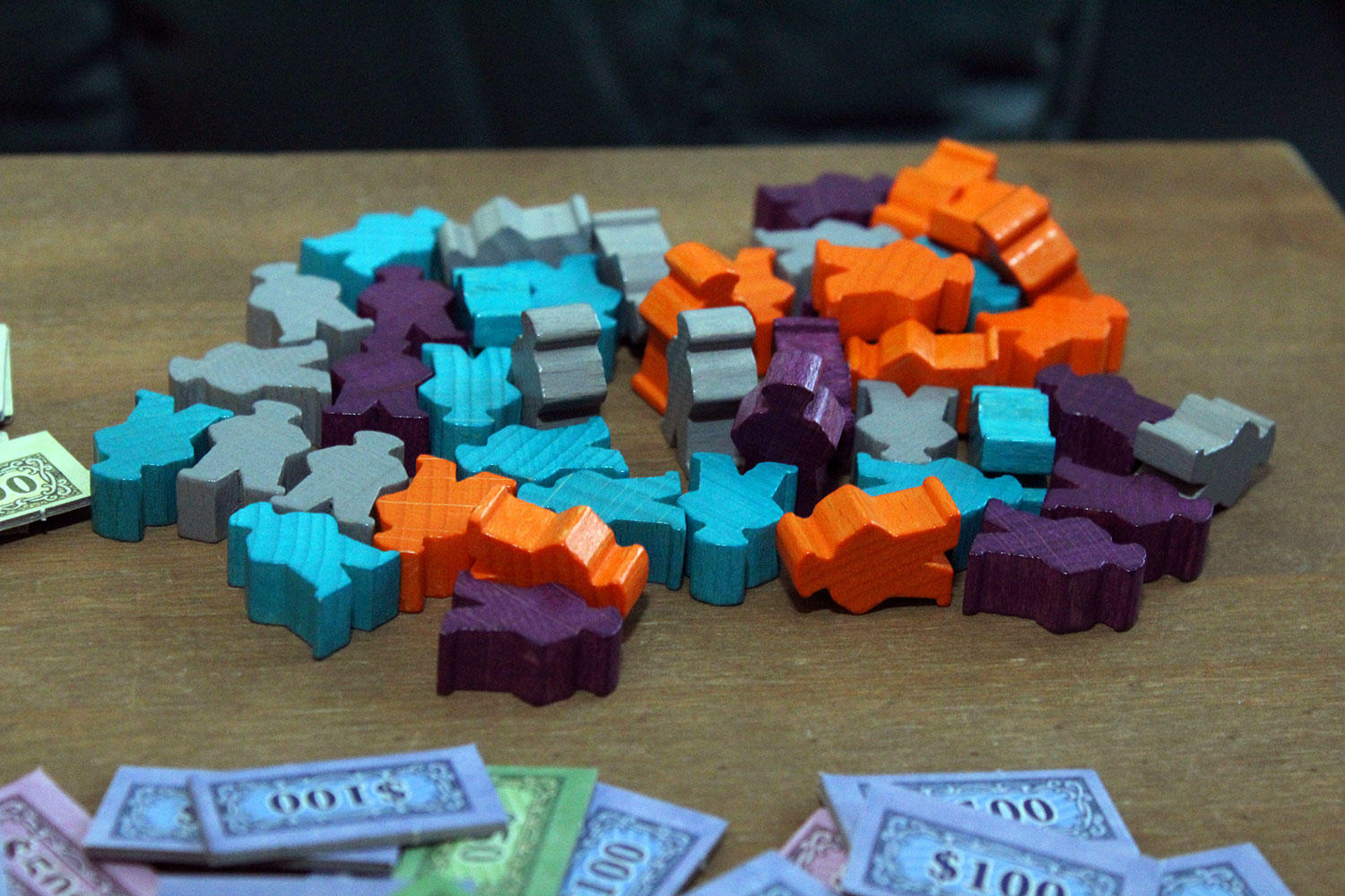 Das Spielmaterial ist mit 198 Holzmarkern, sowie 195 Pappplättchen üppig ausgestattet. Auf Papiergeld wurde glücklicherweise verzichtet. Stattdessen liegt es in Form von Pappmarkern in 4 unterschiedlichen Einheiten und ausreichender Menge bei.