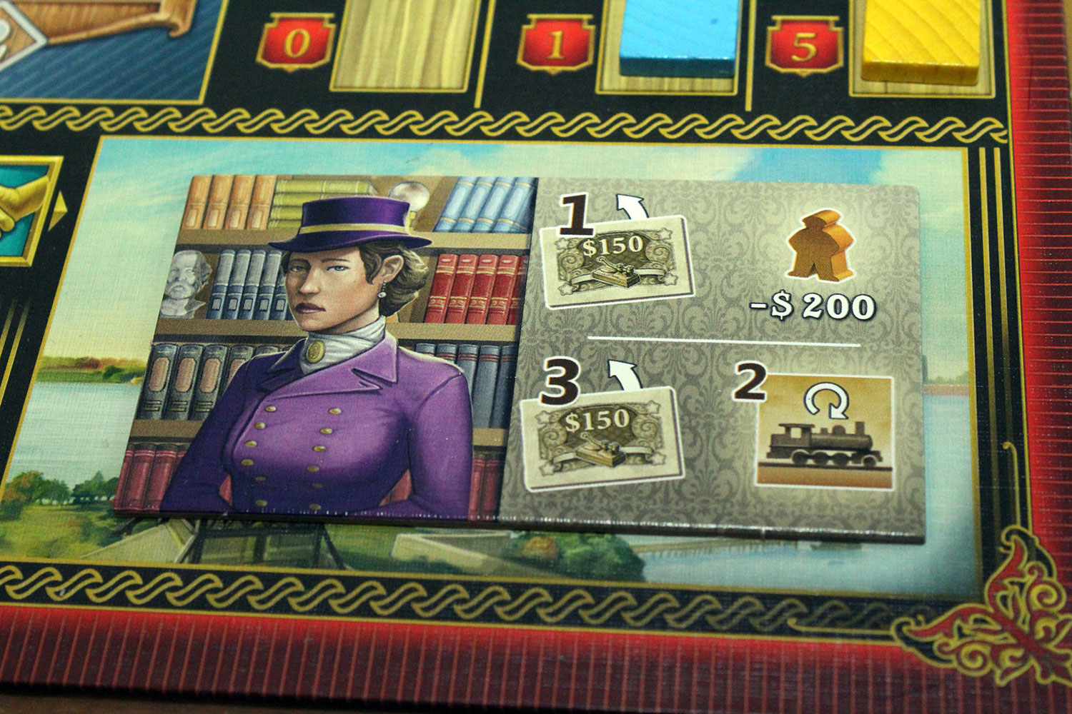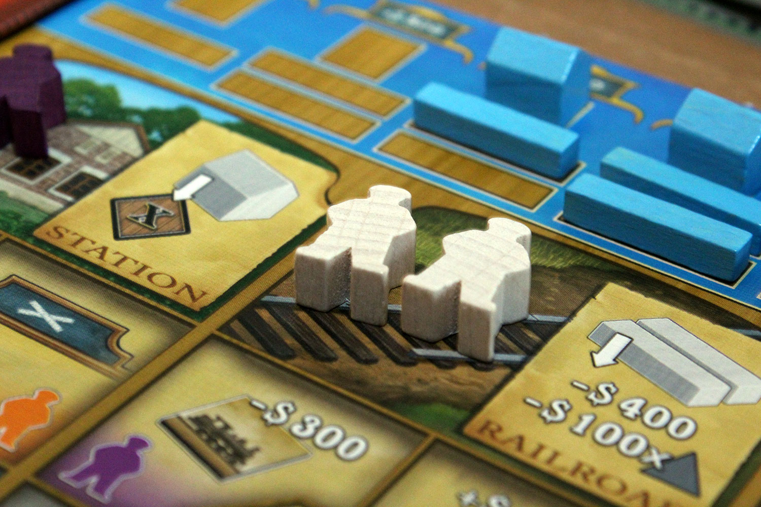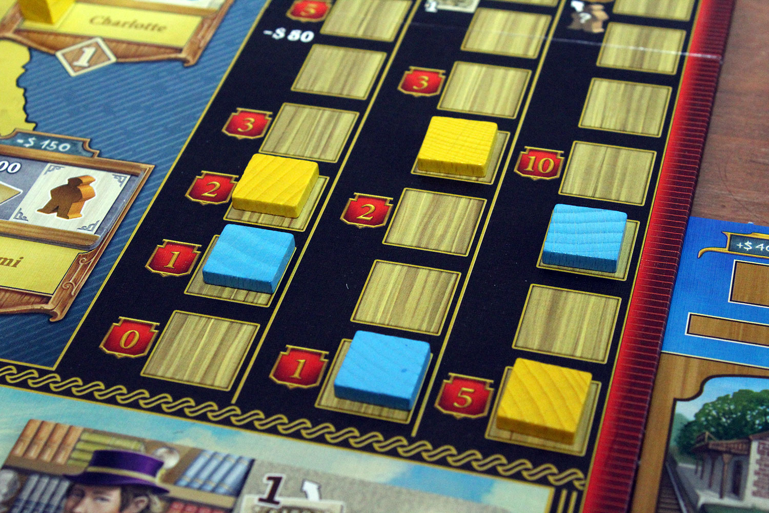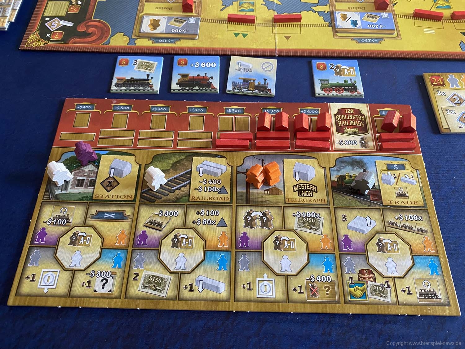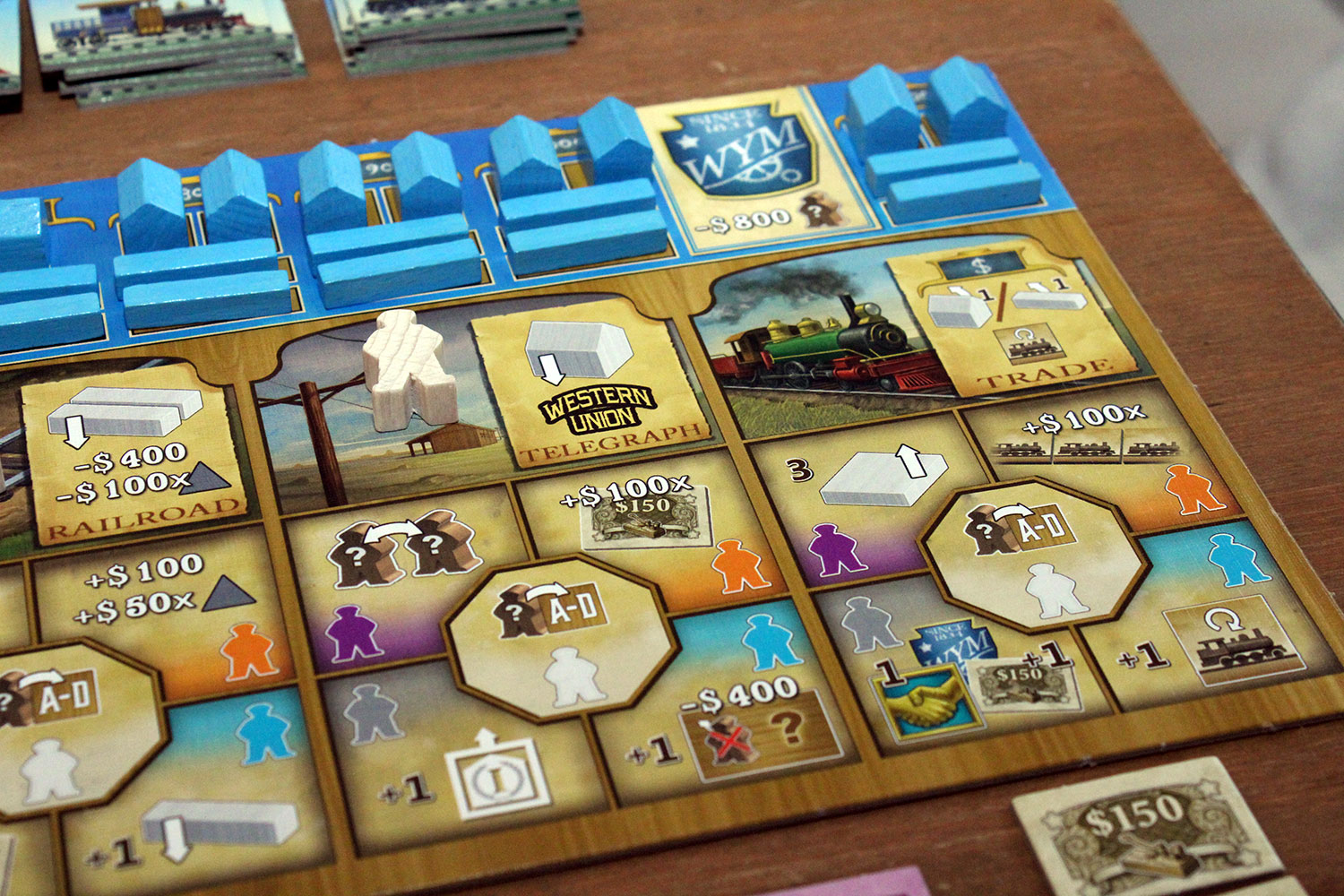 Die Spielertableaus sind in drei Bereiche eingeteilt. Ganz oben werden die Gebäude und Schienen gezeigt, die der Spieler errichten kann. Darunter sind die vier Hauptaktionen und in der untersten Zeile die dazugehörigen Zusatzeffekte, die je nach Wahl des eingesetzten Arbeiters (Farbe) ausgeführt werden dürfen, aufgeführt.