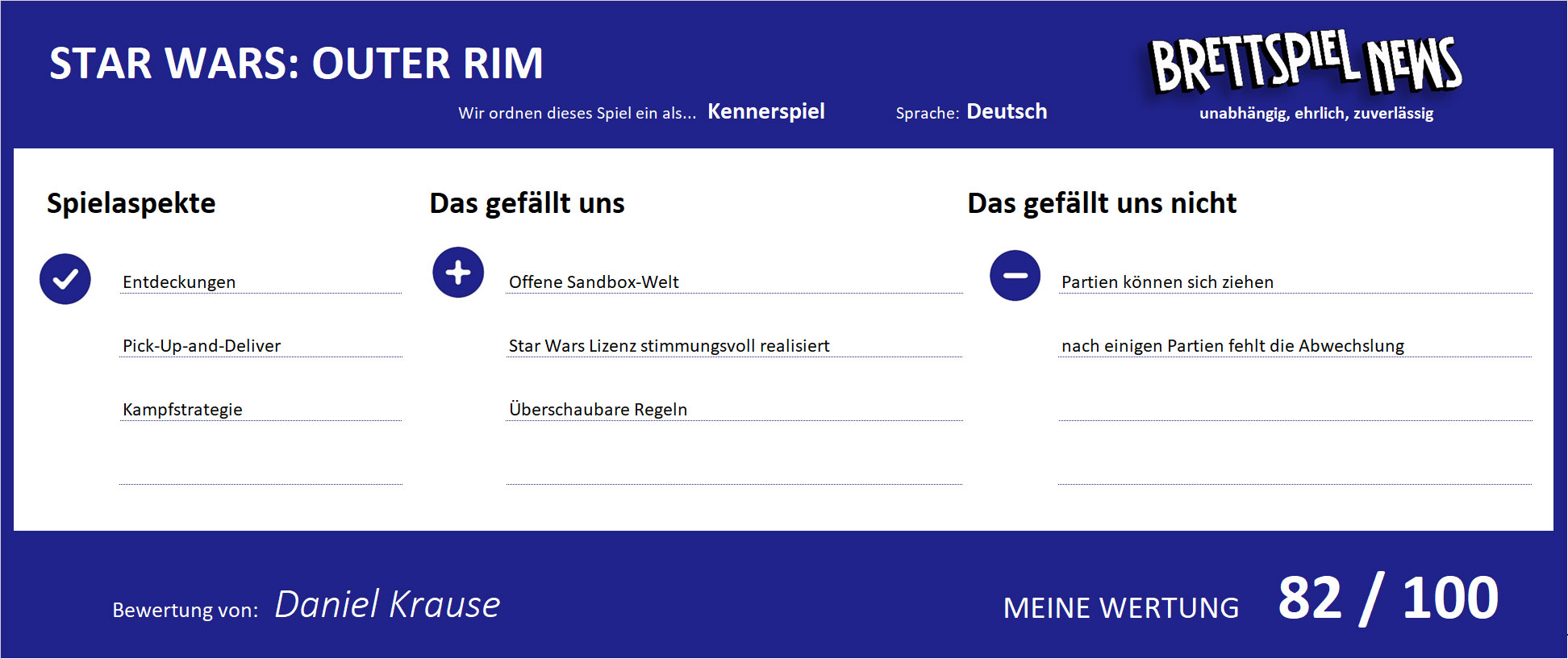 Wie es sich für ein Rollenspiel gehört, geht es bei OUTER RIM vornehmlich darum, seinen Charakter mit dem Ziel, berühmt zu werden, zu entwickeln. Die spielerische Freiheit auf dem Weg dorthin ist grundsätzlich gut und macht viel Spaß. Mir persönlich haben die Partien viel Freude bereitet und immer wieder haben sich neue Dinge ergeben, die die Spielrunden haben einzigartig werden lassen.