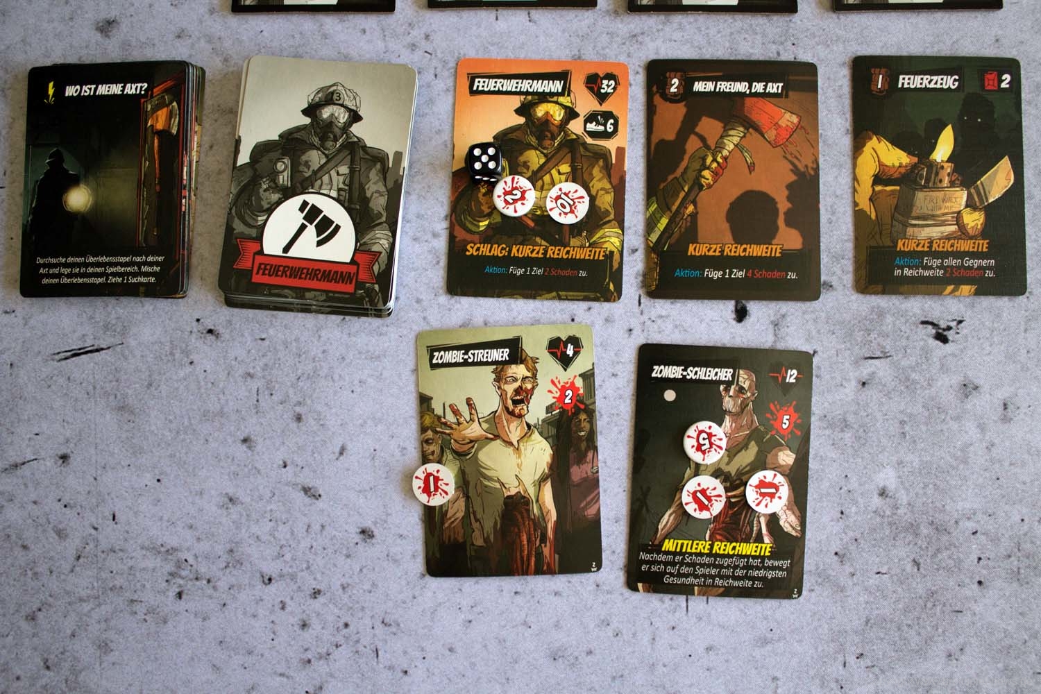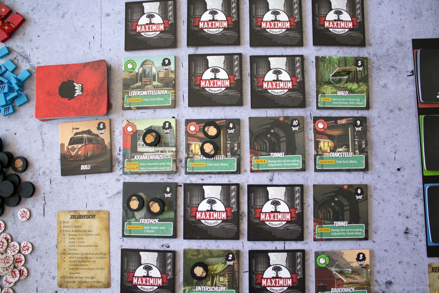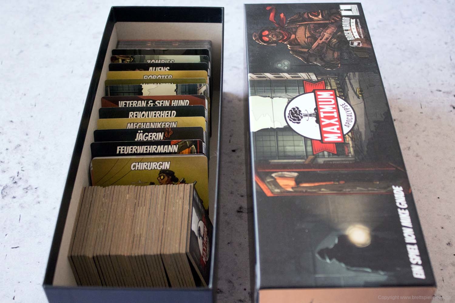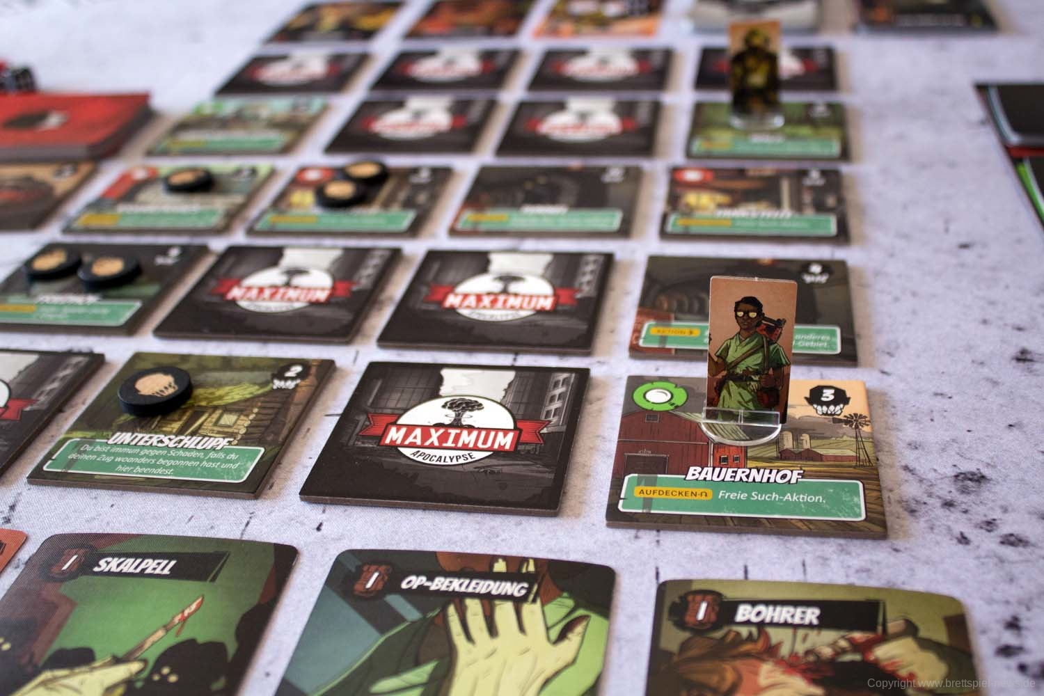Im Kern besteht MAXIMUM APOCALYPSE aus einer ganzen Reihe Karten und 38 Gebietsplättchen. Die Karten verfügen über eine widerstandsfähige Oberfläche, wobei es thematisch eigentlich sogar passen würde, wenn sie speckig und abgegriffen wären. Die Gebietsplättchen und das Suchtableau sind aus sehr dickem Karton und sollten auch kleinere Angriffe problemlos überstehen. Des Weiteren gibt es noch einige Holztoken für Gegner, Munition und Benzin sowie Pappmarker, u.a. für die Lebenspunkte. Als Heldenfiguren dienen Standees.