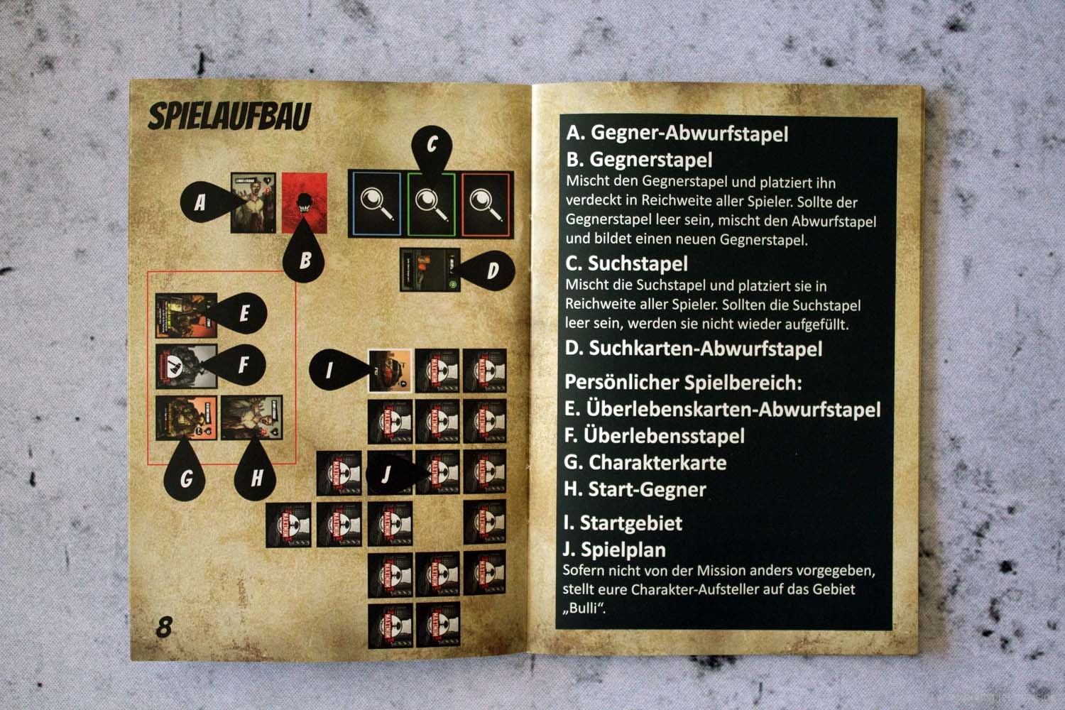 Zu Beginn wählt jeder Spieler einen der 8 verfügbaren Helden aus und nimmt sich das passende Kartendeck. Die Decks zu jedem Helden sind individuell auf den Charakter abgestimmt und spielen sich unterschiedlich. Nach der Wahl der Mission wird das Spielfeld entsprechend der Vorgaben verdeckt ausgelegt. Die Form, in der die einzelnen Gebietsplättchen angeordnet werden, können die Spieler frei wählen. Einzige Bedingung ist, dass der Bully am Ende außen an ein Gebiet angrenzend ausliegen muss. Die Suchkarten für die Stapel Blau, Rot und Grün werden zusammengestellt, das passende Gegnerdeck wird gemischt und die passenden Standees für die Helden werden auf dem Startfeld positioniert. Die Spieler ziehen 4 Karten von ihren Decks als Starthand und jeweils eine Gegnerkarte, die sie vor sich ablegen. Das war’s, das apokalyptische Abenteuer kann beginnen!