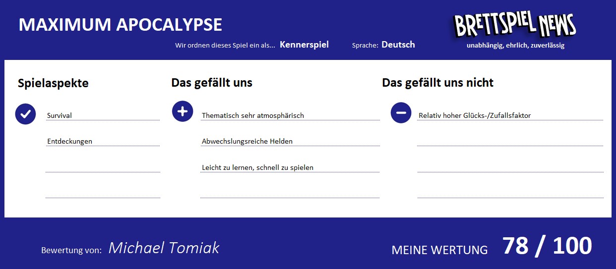 Selbst wenn die Zufallsfaktoren bei manchen Partien reichlich nerven können, hat mich MAXIMUM APOCALYPSE nicht nur überzeugt, sondern schafft es dank seiner herrlichen Endzeitstimmung zum Teil auch immer wieder, mich in seinen Bann zu ziehen. Als Freund des italienischen Genrekinos der 70er- und 80er-Jahre habe ich hier die Chance, meinen Film selbst zu spielen. Mit den verschiedenen Helden und Gegnern habe ich dabei die Möglichkeit, beim Thema immer wieder ein Stück weit zu variieren. Ich freue mich schon auf die Erweiterung, die ebenfalls bei GRIMSPIRE erscheinen wird. Bis dahin werde ich aber erst einmal die dystopische Welt von MAXIMUM APOCALYPSE von all ihren Zombies, Mutanten, Robotern und Aliens befreien.