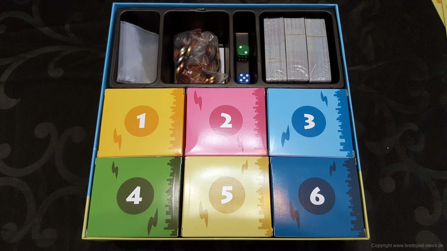 Das größte Legacyelement, neben neuen Karten, sind die sechs geheimnisvollen Boxen, welche vor allem eines enthalten: viel Luft. So viel Luft, dass die Verpackung am Ende zu 2/3 einfach leer ist. Hier wurde wohl einfach Verkaufspsychologie angewandt, um mit einer großen Schachtel einen großen Preis zu rechtfertigen. Denn was am Ende aus einer faustgroßen Schachtel herauskommt, finde ich schon fast frech. Zumindest befinden sich darin neue Spielinhalte, die ab dem Zeitpunkt der Öffnung der Schachtel das Spiel begleiten. Gerade die letzte Box fand ich besonders spannend. Ich hatte schon fünf Boxen geöffnet und habe die sechste geschüttelt, um zu prüfen, ob uns das gleiche wie bei den anderen Schachteln bevorsteht. Als ich sie öffnete, musste ich lachen. Es war noch weniger drin als in den anderen. Aber selbst nach dem Öffnen aller Boxen und mit allen Karten entspricht die Komplexität des Spiels die eines Familienspiels. Es bleibt MACHI KORO.