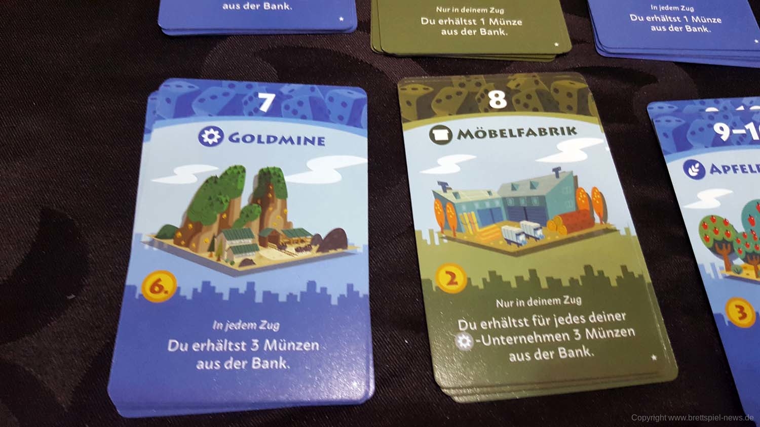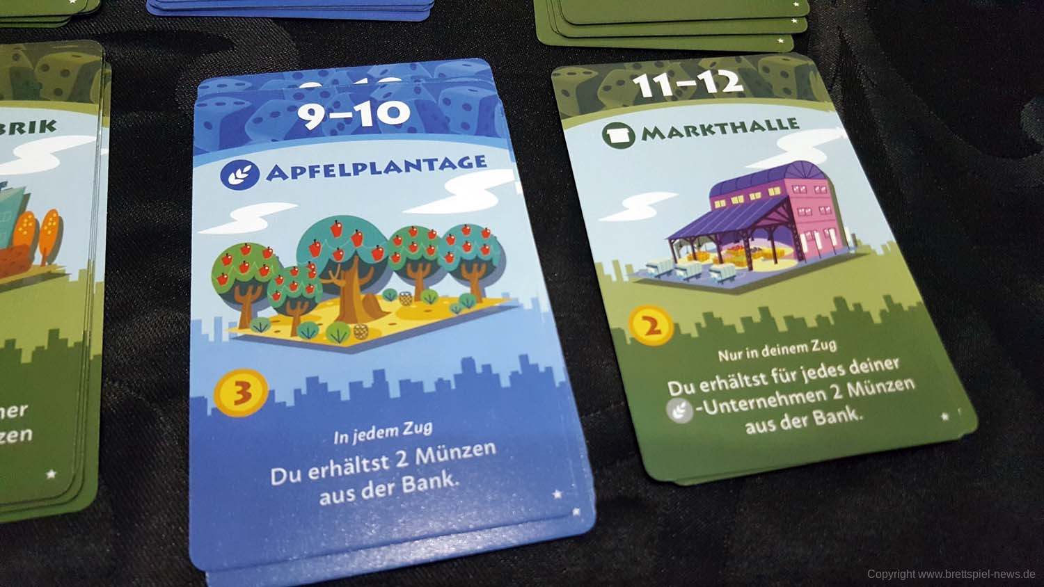 In der Spielfeldmitte werden alle Unternehmenskarten aufsteigend nach ihren Werten ausgelegt. Beginnend bei der Nummer 1, dem Weizenfeld, bis zur Nummer 11-12, der Markthalle. Die Werte geben an, welche Zahl gewürfelt werden muss, damit das Unternehmen aktiviert wird. Die Aktivierung ist auch noch abhängig von der Farbe des Unternehmens. Blaue Gebäude können auch im Zug des Gegners aktiviert werden und grüne lediglich im eigenen. Jede Aktivierung bringt mehr Münzen ein, die wieder für neue Unternehmen ausgegeben werden können.