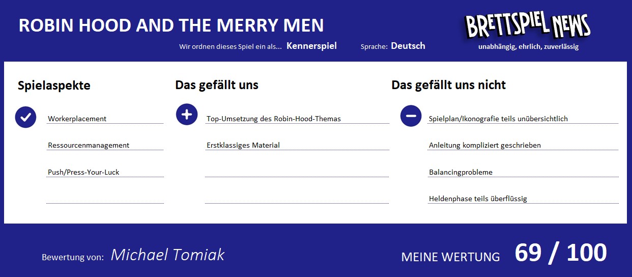 Schlussendlich bin ich mir nicht sicher, was ich von ROBIN HOOD AND THE MERRY MEN halten soll. Es ist weit davon entfernt, ein schlechtes Spiel zu sein, es gibt aber zu viele Probleme, als dass es mich wirklich überzeugen kann. Am Ende hatte ich zu oft das Gefühl, nicht wirklich viel durch meine Aktionen zu bewirken. Das Aufstellen von Barrikaden und Fallen war auf Dauer ermüdend und hinterließ nicht das Gefühl, dass ich als Beschützer der Armen die Welt verändern würde. Mir persönlich ist beim Spiel vieles zu zufällig, es gibt nur sehr beschränkte Möglichkeiten, richtig zu planen, und die Aktionen an sich verlieren von Runde zu Runde immer mehr an Reiz für mich. Was das Spiel thematisch an ganz großer Klasse mitbringt, lässt es bei der Mechanik leider vermissen.