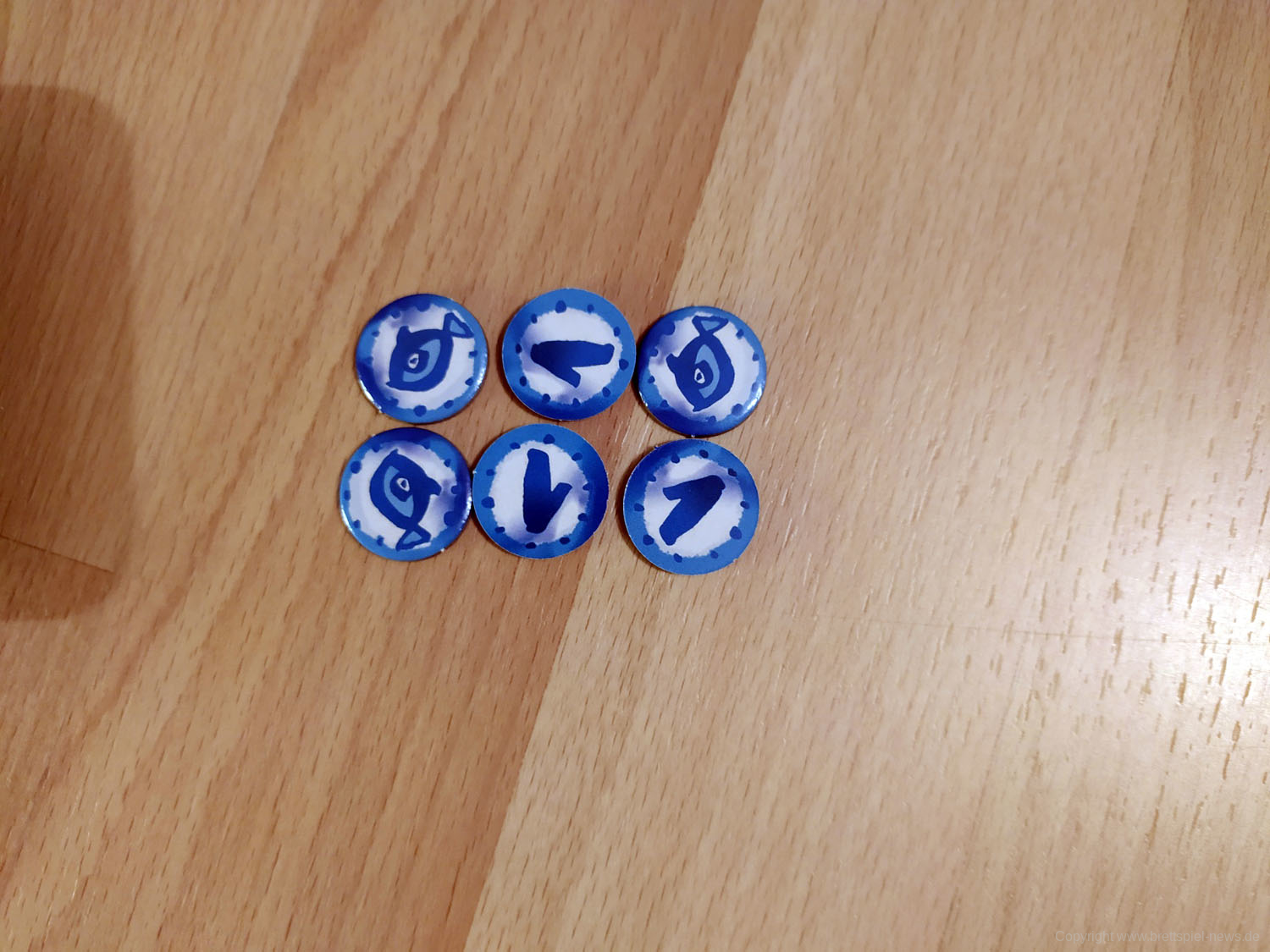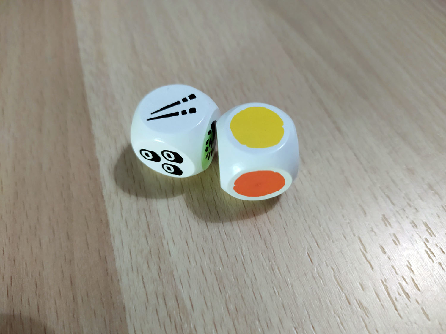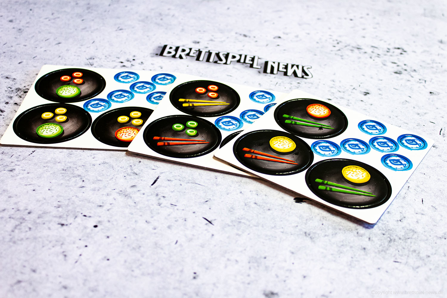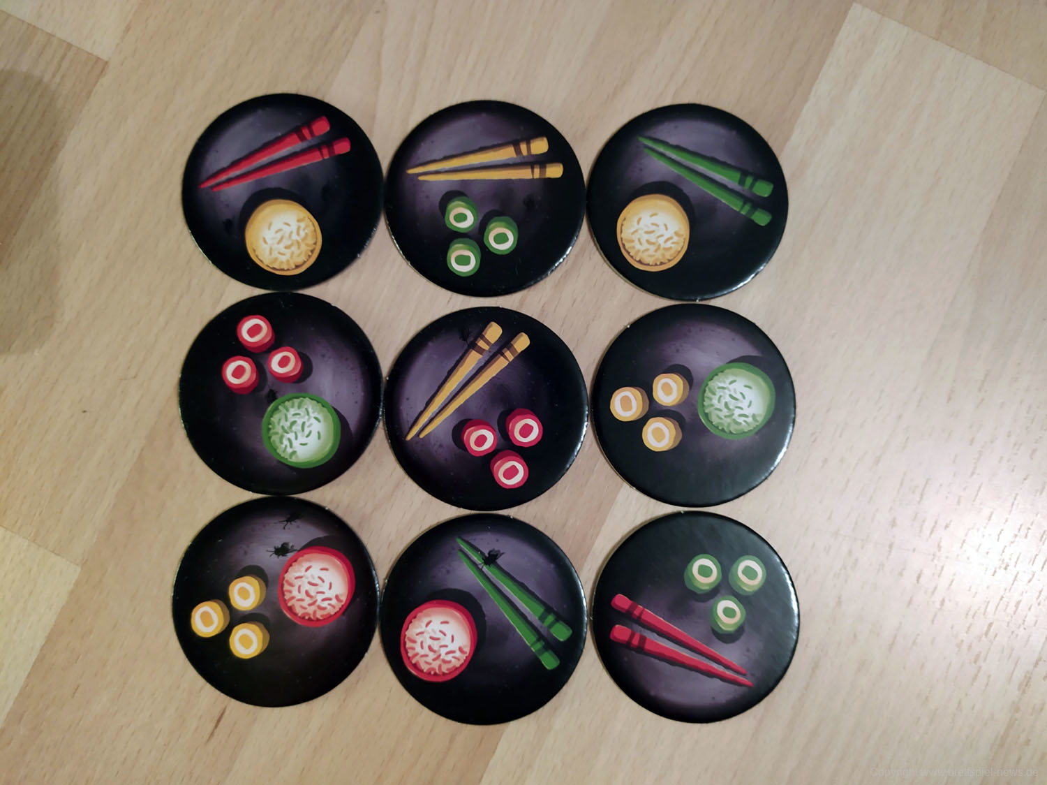 Gesucht wird nun das Plättchen, das die fehlenden Symbole und Farben zeigt. Der Spieler, der dieses zuerst entdeckt, schnappt sich dieses Plättchen und legt es vor sich ab. Wird das Plättchen gesucht, das schon vor einem Spieler liegt, wird es richtig interessant. Der Spieler, vor dem das Plättchen liegt, muss den Sushimeister aus der Mitte schnappen und ihn quietschen lassen.