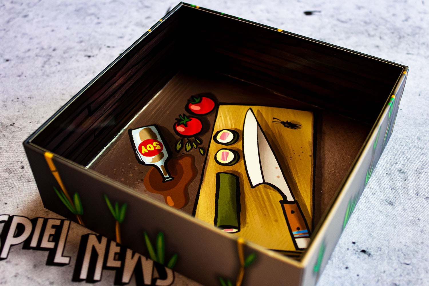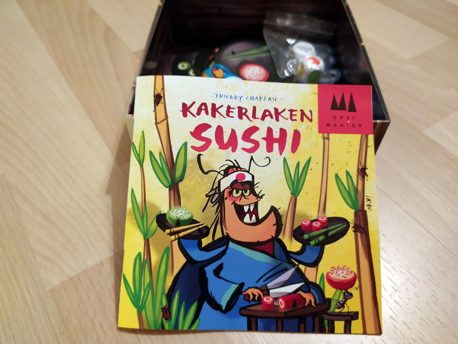 Der Karton ist von guter Qualität, jedoch wäre ein Sortiersystem wünschenswert, da es doch ziemlich viele Taler und Plättchen gibt, die so einfach im Karton herumfliegen. Die Anleitung ist sehr einfach geschrieben, wodurch das Spiel ohne große Komplikationen starten kann. Sehr süß gemacht ist der Sushimeister in Form einer Kakerlake, wie sie schon auf dem Karton abgebildet ist. Leider ist er aber aufgrund seiner Machart ziemlich schwer zum Quietschen zu bringen, vor allem bei einer schnellen Aktion wie bei diesem Spiel.