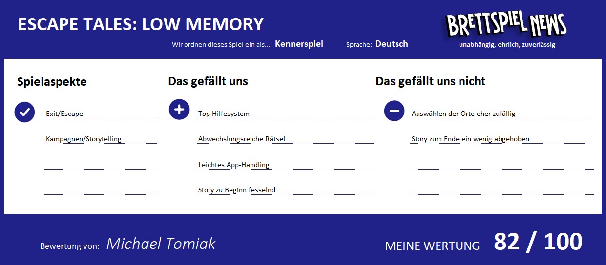 Insgesamt empfand ich ESCAPE TALES – LOW MEMORY als einen wunderbar fordernden und unterhaltsamen Escape-Room-Thriller, der in erzählerischer Hinsicht im Finale leider deutlich schwächelt, nachdem er zuvor zu glänzen verstand. In Sachen Rätseldesign und immersives Gefühl versteht er das Spiel vor allem in den ersten beiden Kapiteln zu punkten. Wenn der Einsatz der Aktionsscheiben in Verbindung mit der Auswahl des nächsten Rätselfeldes noch überabreitet wird und das Finale mehr im Kontext der Geschichte bleibt und nicht in unendliche Sphären abdriftet, könnte ein dritter Ableger der ESCAPE TALES-Reihe für einen Glanzpunkt im Escape-Room-Genre sorgen. Doch bereits LOW MEMORY macht so viel richtig, dass Anhänger dieses Genres sich das Spiel nicht entgehen lassen sollten. Für mich eine klare Empfehlung!