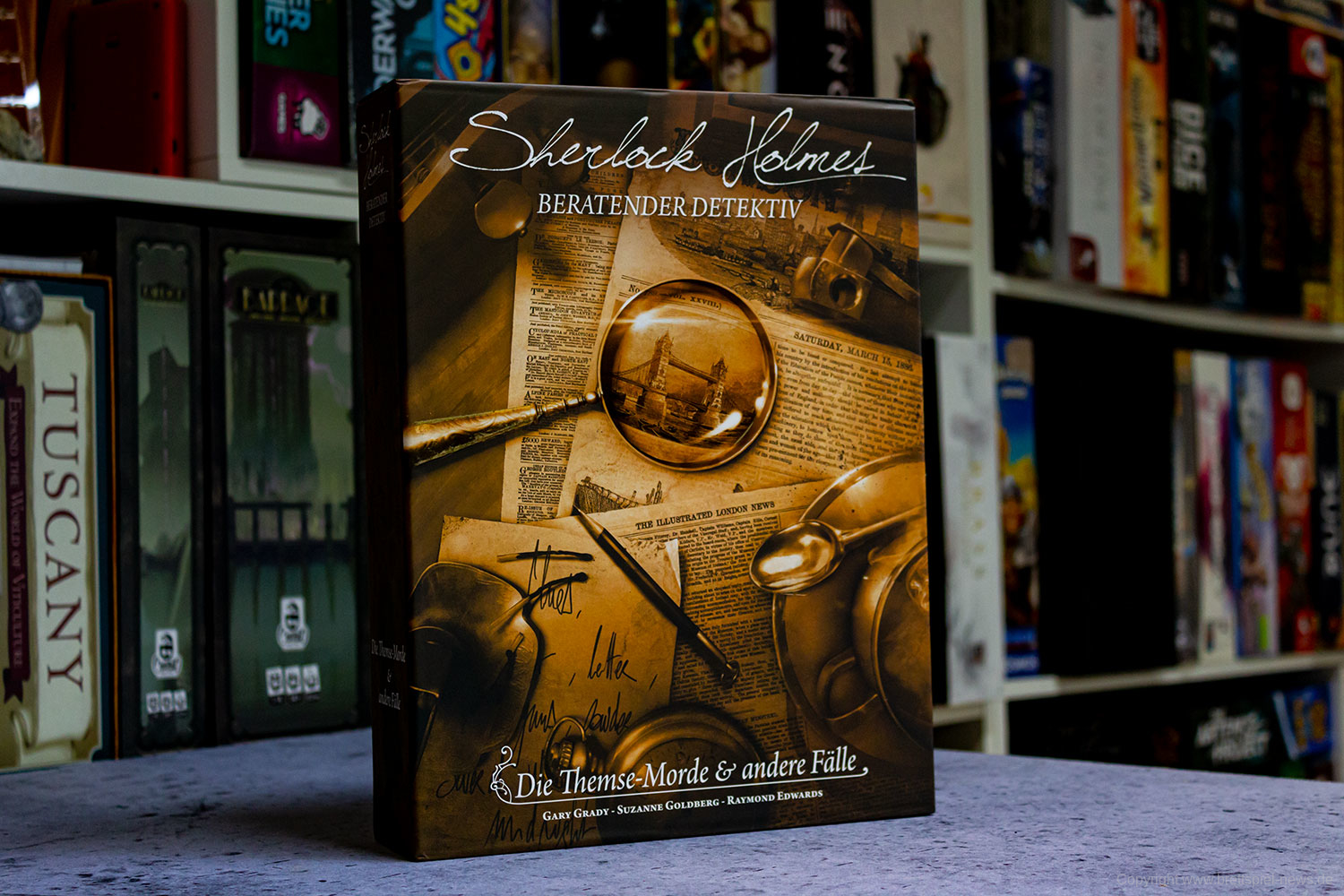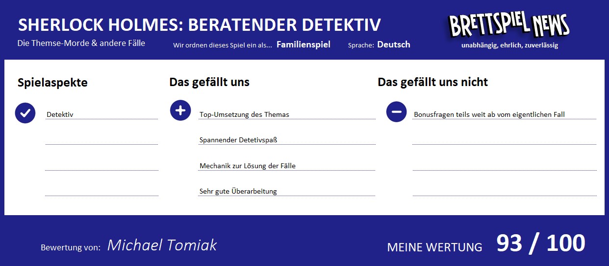 Es dürfte nicht schwer zu erkennen sein, dass SHERLOCK HOLMES: BERATENDER DETEKTIV – DIE THEMSE-MORDE & ANDERE FÄLLE für mich nicht nur einen ganz großen Klassiker, sondern zumindest einen persönlichen Meilenstein darstellt. Wenn es ein Spiel geschafft hat, mich im Grunde meine Leben lang zu begleiten, dann ist das SHERLOCK HOLMES CRIMINAL-CABINET. Die Neuauflage von Space Cowboys lässt das Original nun im Regal stehen, da die Überarbeitung so perfekt gelungen ist, dass die Faszination des Originals erhalten blieb, während das Material auf zeitgemäßes Niveau gebracht wurde. Freunden von Detektivrätseln kann ich SHERLOCK HOLMES: BERATENDER DETEKTIV – DIE THEMSE-MORDE & ANDERE FÄLLE nur eindeutig ans Herz legen.
