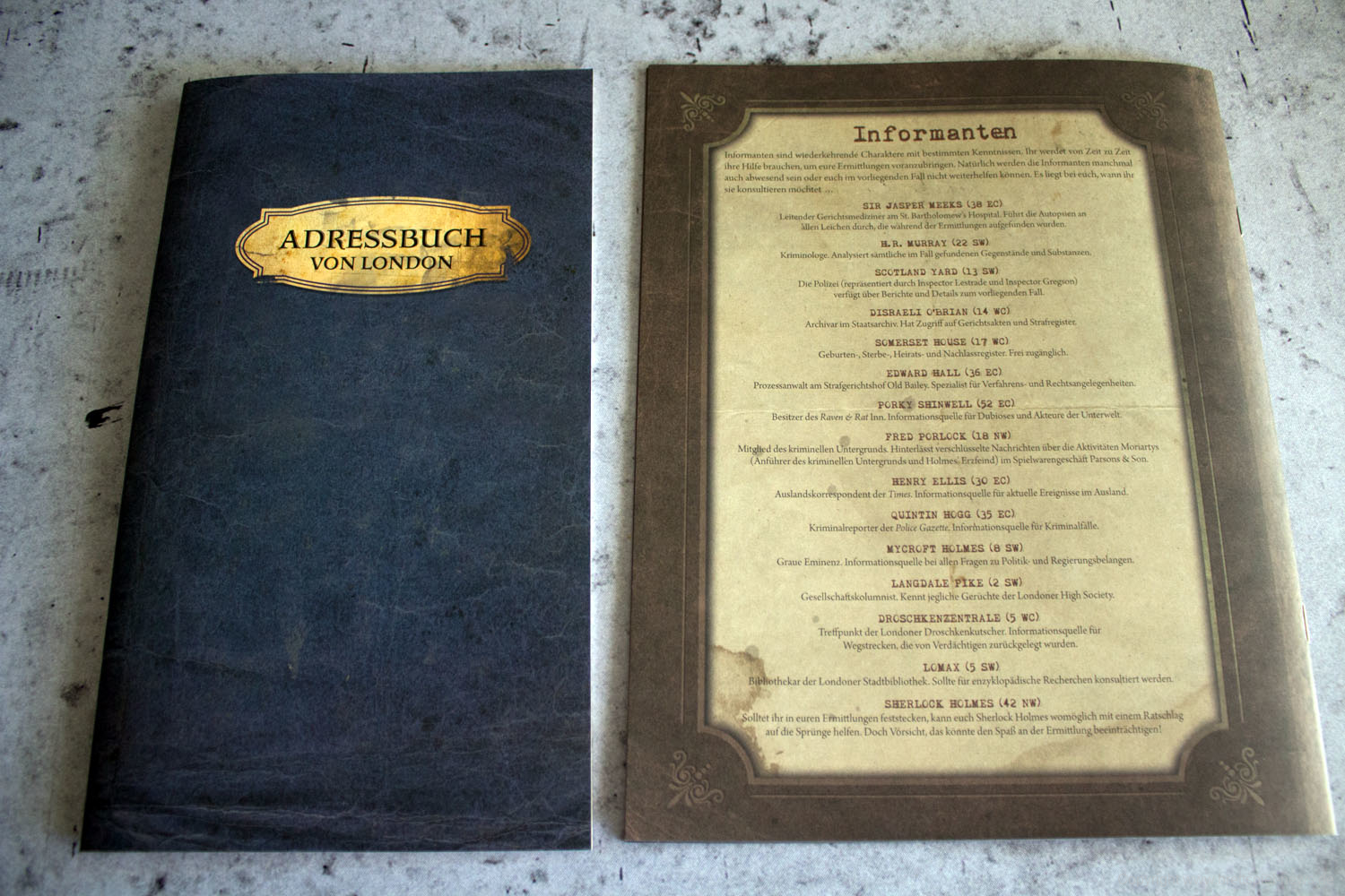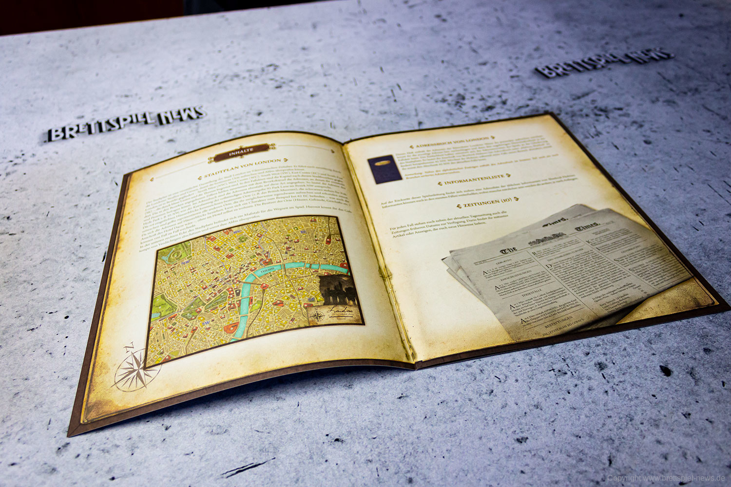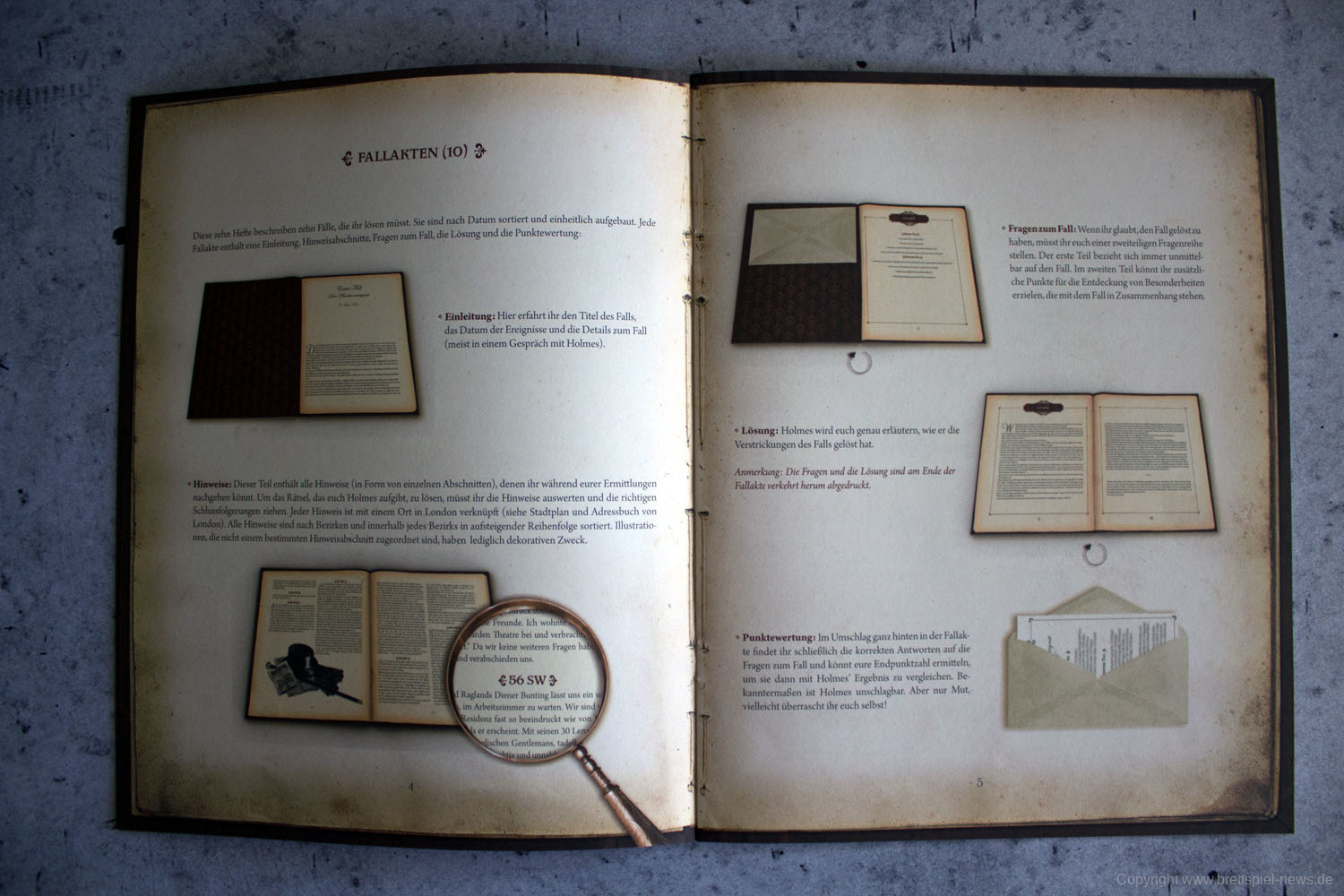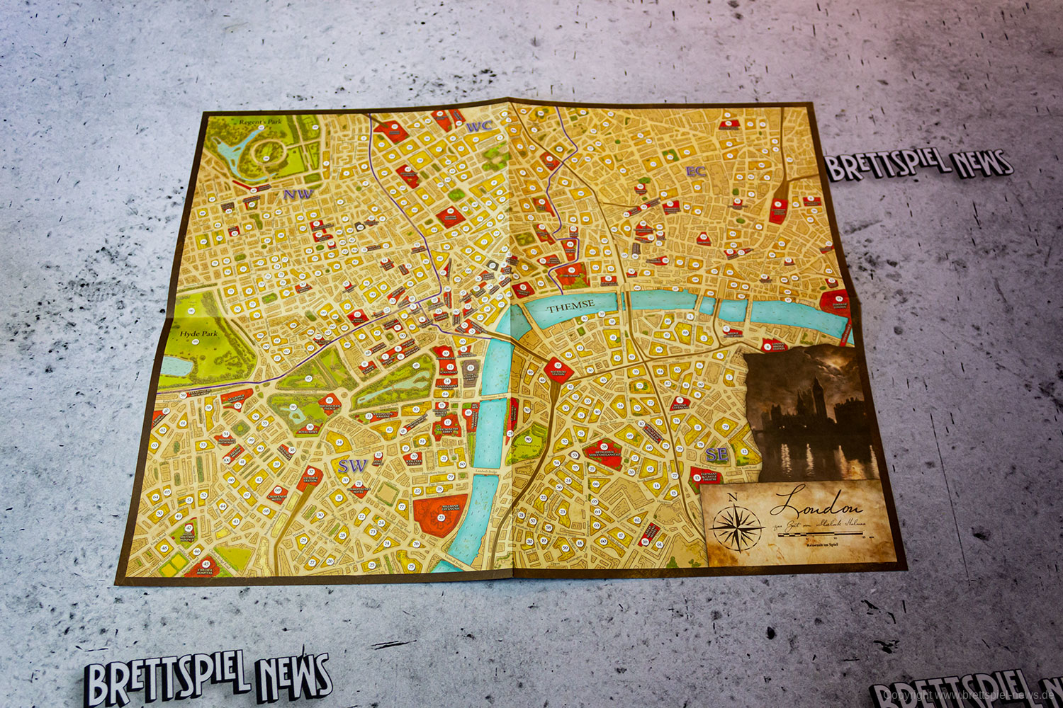 Das Aufteilen des großen Abenteuerbuchs auf Fallakten ist eine gute Idee, die das Handling während des Spiels deutlich erleichtert. Gleiches gilt für die Zeitungen, die nun ebenfalls als einzelne Seiten beiliegen und nicht mehr als Heft, wie noch beim Original. Im Grunde hat Space Cowboys hier die Umsetzung ihrer MYTHOS TALES, welche wiederum auf der Idee von SHERLOCK HOLMES CRIMINAL-CABINET basiert, auf SHERLOCK HOLMES: BERATENDER DETEKTIV – DIE THEMSE-MORDE & ANDERE FÄLLE übertragen. Die deutschen Texte wurden komplett neu übersetzt, die Fragen überarbeitet und zu guter Letzt noch eine ganze Reihe weiterer Orte hinzugefügt, da im Original oftmals logisch erscheinende Orte schlichtweg als Text fehlten. Space Cowboys hat also weitaus mehr getan, als einfach nur ein bisschen den durchzulüften und den Mief rauszulassen. Sie haben einen ohnehin schon erstklassigen Titel runderneuert, ohne seinen Kern zu zerstören.