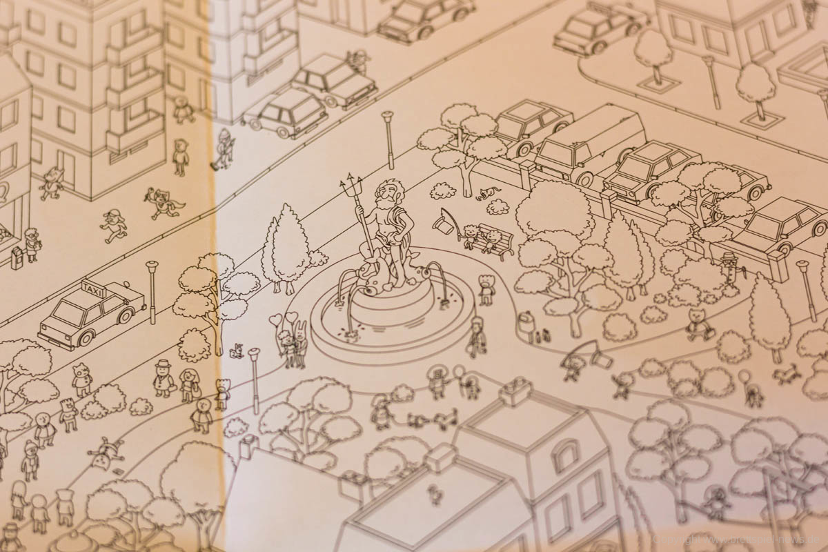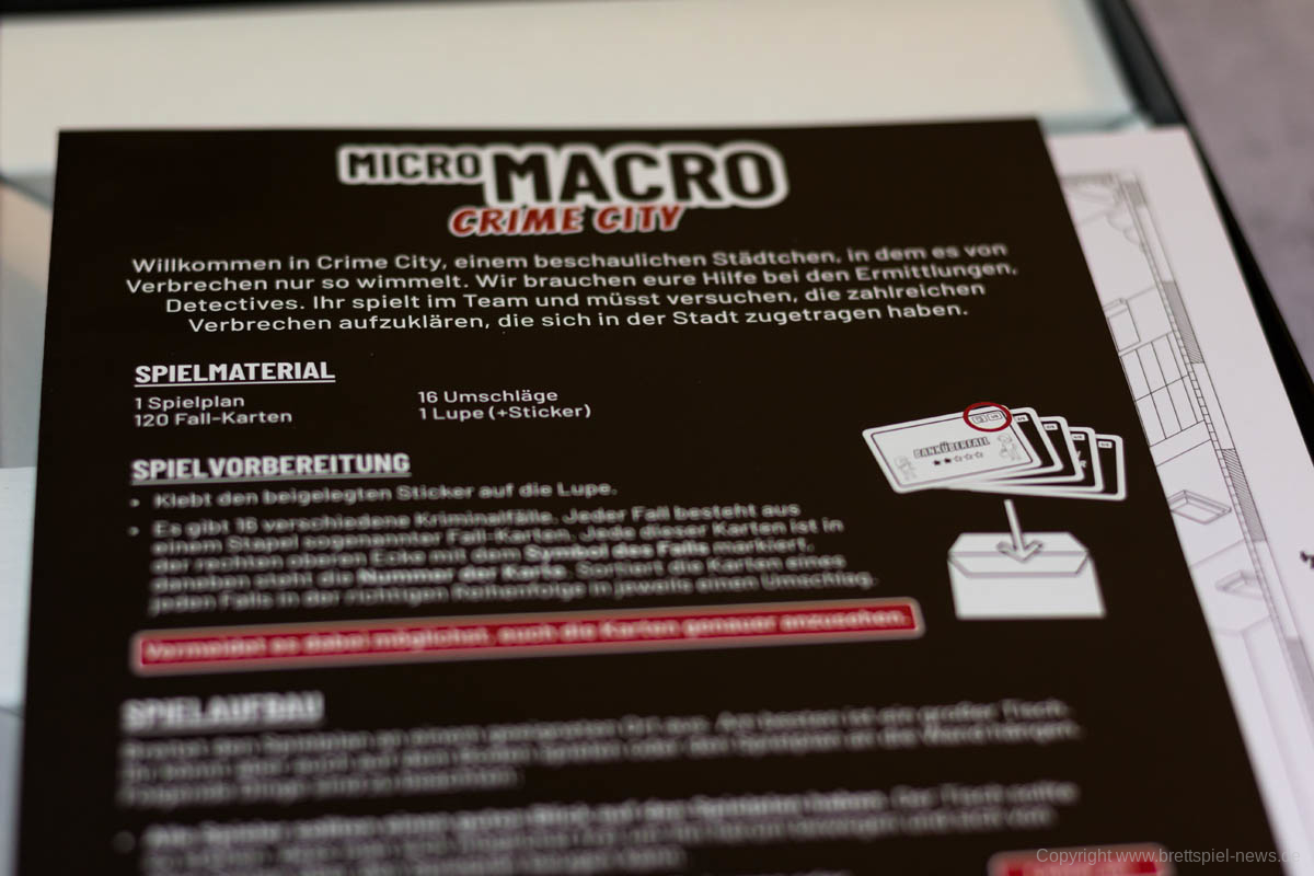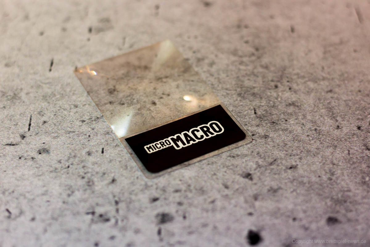 MICROMACRO bietet etwas komplett Neues - auch für Spieleinsteiger - an, denn das Absuchen des riesigen Spielplans, in dem sich viele unterschiedliche Kriminalfälle verstecken, unter Einsatz einer Lupe gab es bisher nicht. Lediglich von 7th Continent ist mir der Einsatz einer Lupe bekannt, allerdings ist dies dort deutlich komplizierten, weil die Grafiken in Farbe und teilweise sehr klein gedruckt sind. Die Verwendung eines riesigen Wimmelbildes ist eine einfache, aber sehr gute Idee, die bestens funktioniert.