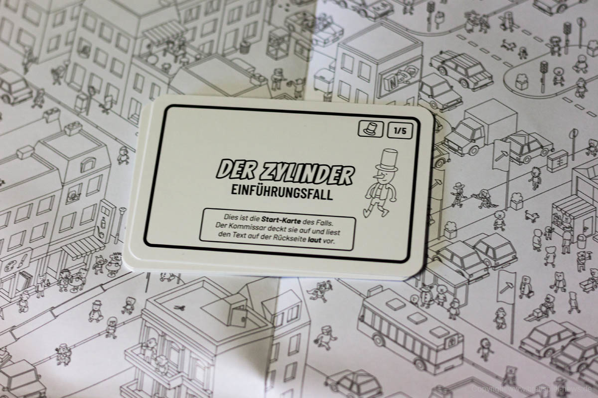 Grundlegend funktioniert es so, dass ein Umschlag genommen und die erste Karte umgedreht wird. Der Inhalt der Karte wird laut vorgelesen. Auf der nächsten Karte wird eine Frage gestellt, deren Antwort sich auf dem Spielplan, irgendwo im Gewimmel der Details, finden lässt. Es gibt immer einen Hinweis, wo der Fall startet, indem die Himmelsrichtung und/oder ein konkreter Ort - ein Park, der Hafen oder ähnliches - angegeben wird.