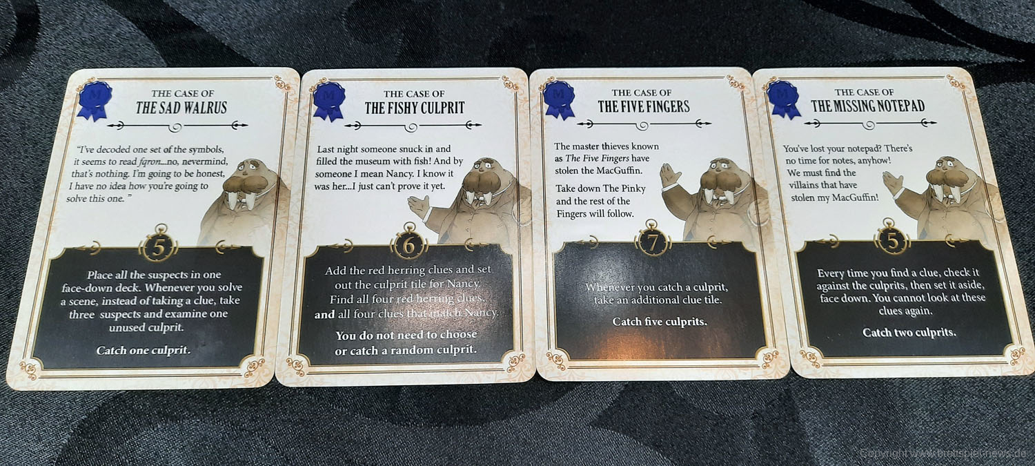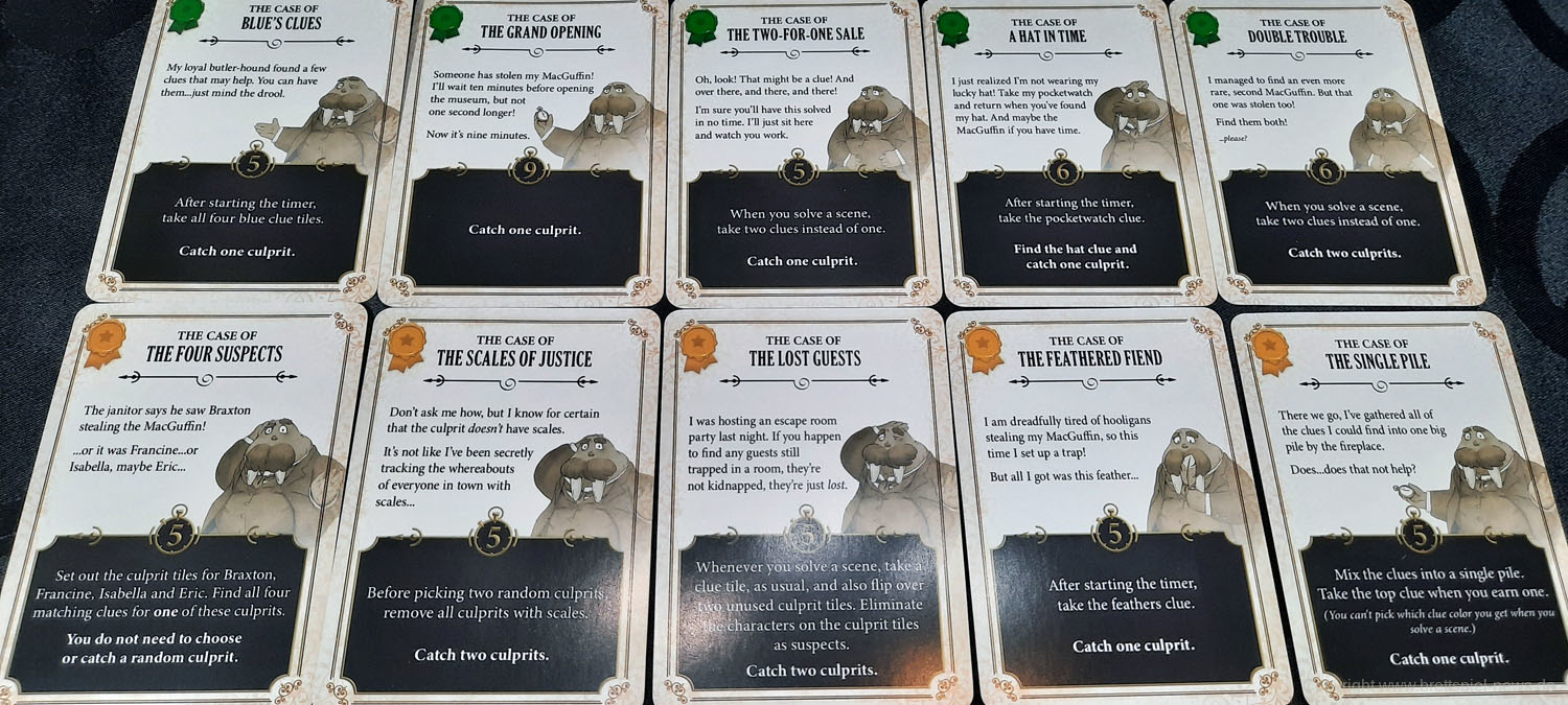 Von einigen wird das Spiel allerdings auch anders wahrgenommen. Das Suchen auf den Szenekarten wird als repetitiv und einseitig angesehen. Die Auswahl der Hinweisplättchen ist zu glückslastig für ein Deduktionsspiel. Vor allem wenn mit dem roten Hering gespielt wird. Ist der erste Hinweis dieser schlimme Fisch, waren die ersten paar Sekunden umsonst und das Gefühl kommt auf, dass es eine sinnlose Bestrafung war. Eigentlich kann der Versuch ab da an schon neu gestartet werden. Das kann schnell einen negativen Eindruck hinterlassen, zumal es noch ein paar andere Kritikpunkte gibt.