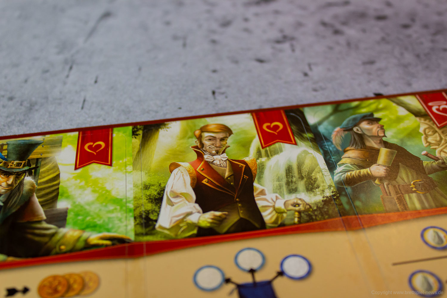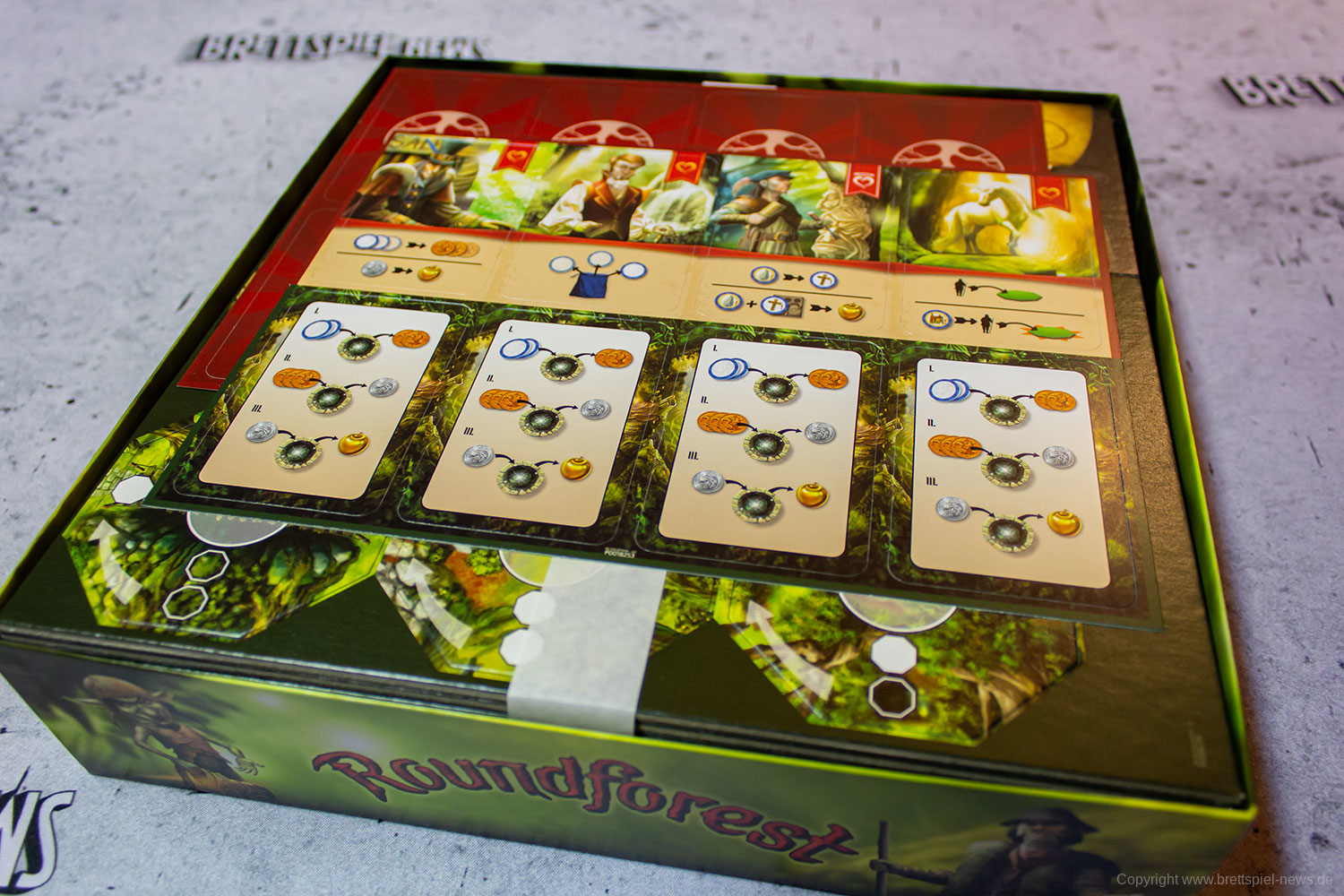 Die Spielschachtel von ROUNDFOREST enthält insgesamt 32 Oktagon-Plättchen, 4 Kunststoff-Figuren in Spielerfarbe, 12 Charakterkarten, 52 Farb-Chips aus durchscheinendem Plastik, 36 Plastikmünzen und diverse weitere Plättchen aus harter Pappe.