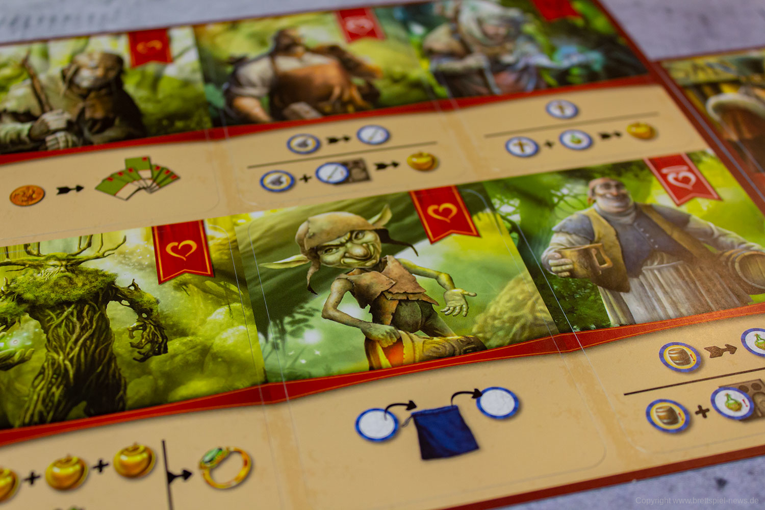 Diese sind in drei Kategorien eingeteilt: Freundliche, feindselige und helfende Charaktere. Helfende Charaktere ermöglichen es den Spielern, eine besondere Fähigkeit einzusetzen, während feindselige und freundliche Charaktere den Spielern Aufgaben auferlegen, die sie erfüllen müssen. Möchte ein Spieler die Fähigkeit eines helfenden Charakters nicht direkt ausführen oder kann ein Spieler die Aufgabe eines feindseligen oder freundlichen Charakters nicht direkt erfüllen, legt er ein entsprechendes Charakterplättchen auf seine Position. Sobald ein anderer Spieler dieses Feld betritt, hat er die Wahl die Aufgabe zu erfüllen oder die Fähigkeit in Anspruch zu nehmen, wodurch das Charakterplättchen abgelegt wird. Anders als bei helfenden Charakteren müssen Spieler, die die Aufgaben der anderen Charaktere nicht sofort erfüllen, die Charakterkarte als „Schuldschein“ in ihren Spielerbereich legen. Solange Spieler einen solchen Schulschein besitzen, können sie das Spiel nicht gewinnen, bis sie den Schuldschein durch das Erfüllen der jeweiligen Aufgabe, das Bezahlen des Charakters mit einem goldenen Apfel oder das Erfüllen der Aufgabe durch einen anderen Spieler ablegen konnten. Schließt ein Spieler den Schuldschein eines anderen Spielers ab, erhält der erfüllende Spieler eine Belohnung, während der Besitzer des Schuldscheins leer ausgeht. Durch das Erfüllen von Aufgaben können die Spieler die begehrten goldenen Äpfel erhalten, die sie zum Beenden des Spiels benötigen. Oft benötigen die Spieler zum Erfüllen einer Aufgabe bestimmte Gegenstände, die sie aus dem Beutel ziehen können oder (anstatt bei einem blauen Plättchen aus dem Beutel zu ziehen) bei der Elfe für Münzen kaufen können.