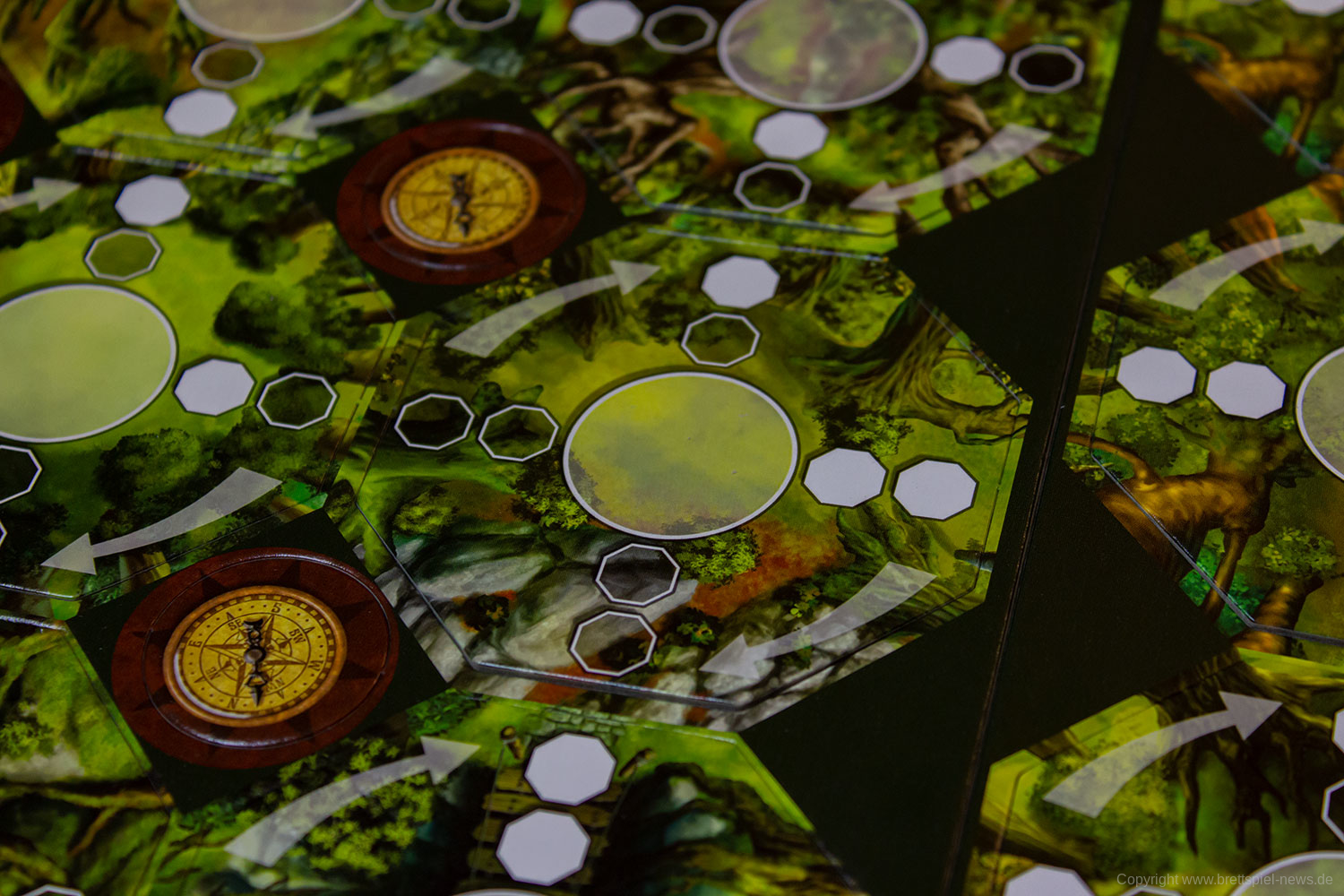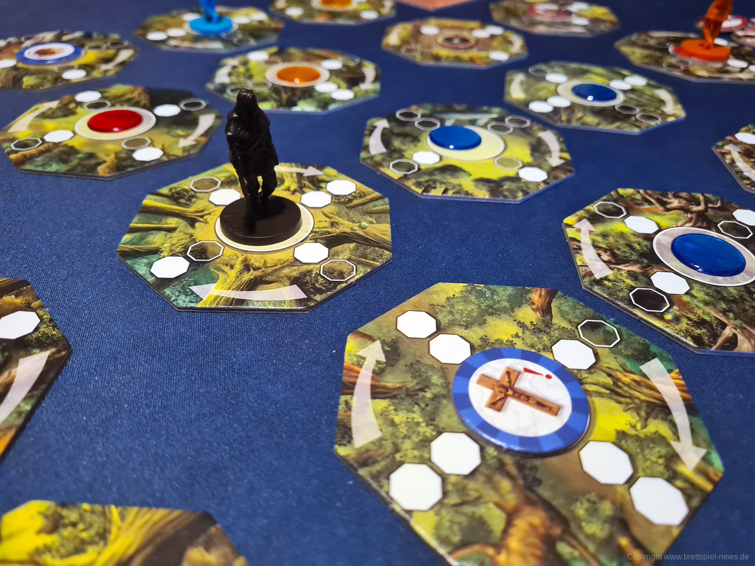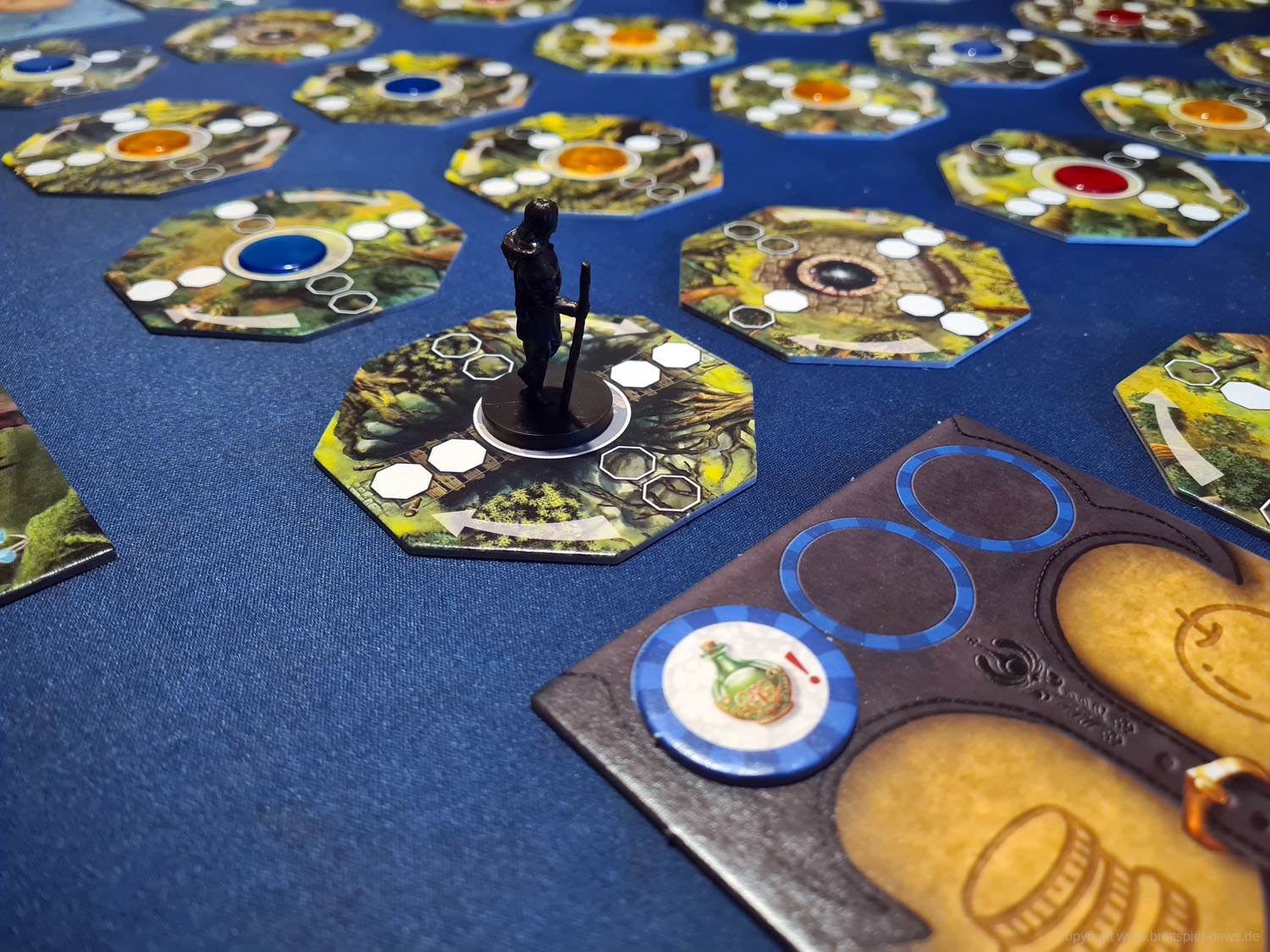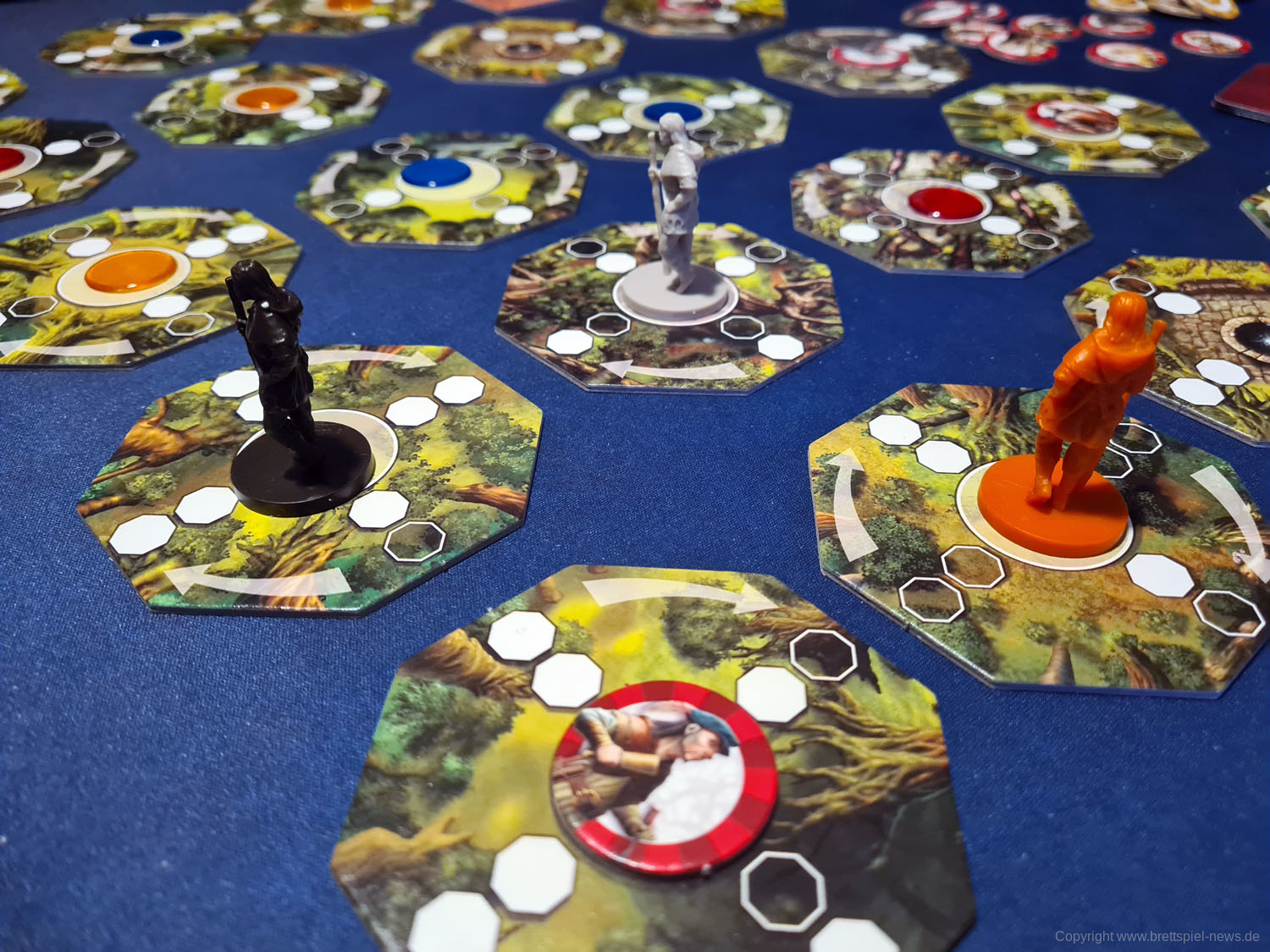 Sind diagonal oder senkrecht zwei weiße Kästchen ausgefüllt, kann sich der Spieler entscheiden, eines der beiden nächsten Plättchen in dieser Richtung zu betreten. Ist nur eines der beiden Felder weiß ausgefüllt, kann der Spieler nur auf das entsprechende Feld ziehen und hat dabei keine Auswahl. Gegebenenfalls muss er damit auch andere Oktagon-Plättchen überspringen und diese von einer anderen Richtung aus betreten. Möchte oder kann ein Spieler sich nicht bewegen, muss er auf dem Plättchen stehen bleiben, auf dem er sich befindet. Betritt er ein neues Plättchen, nimmt er das darauf liegende Farbplättchen auf und führt die mit diesem verbundene Aktion durch. Blaue Plättchen erlauben es dem Spieler, ein Ausrüstungsplättchen aus einem Beutel zu ziehen und in seinen Rucksack zu stecken. Bei einem gelben Plättchen muss der Spieler einen Gegenstand ziehen und auf ein anderes Feld als sein eigenes legen (dieses kann dann von ihm in einem späteren Zug oder von anderen Spielern aufgenommen werden). Ein rotes Plättchen löst schlussendlich eine Begegnung mit einem Bewohner des Waldes aus.