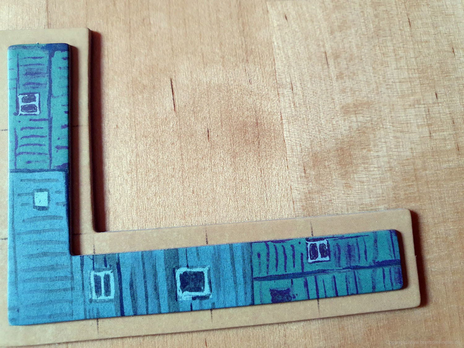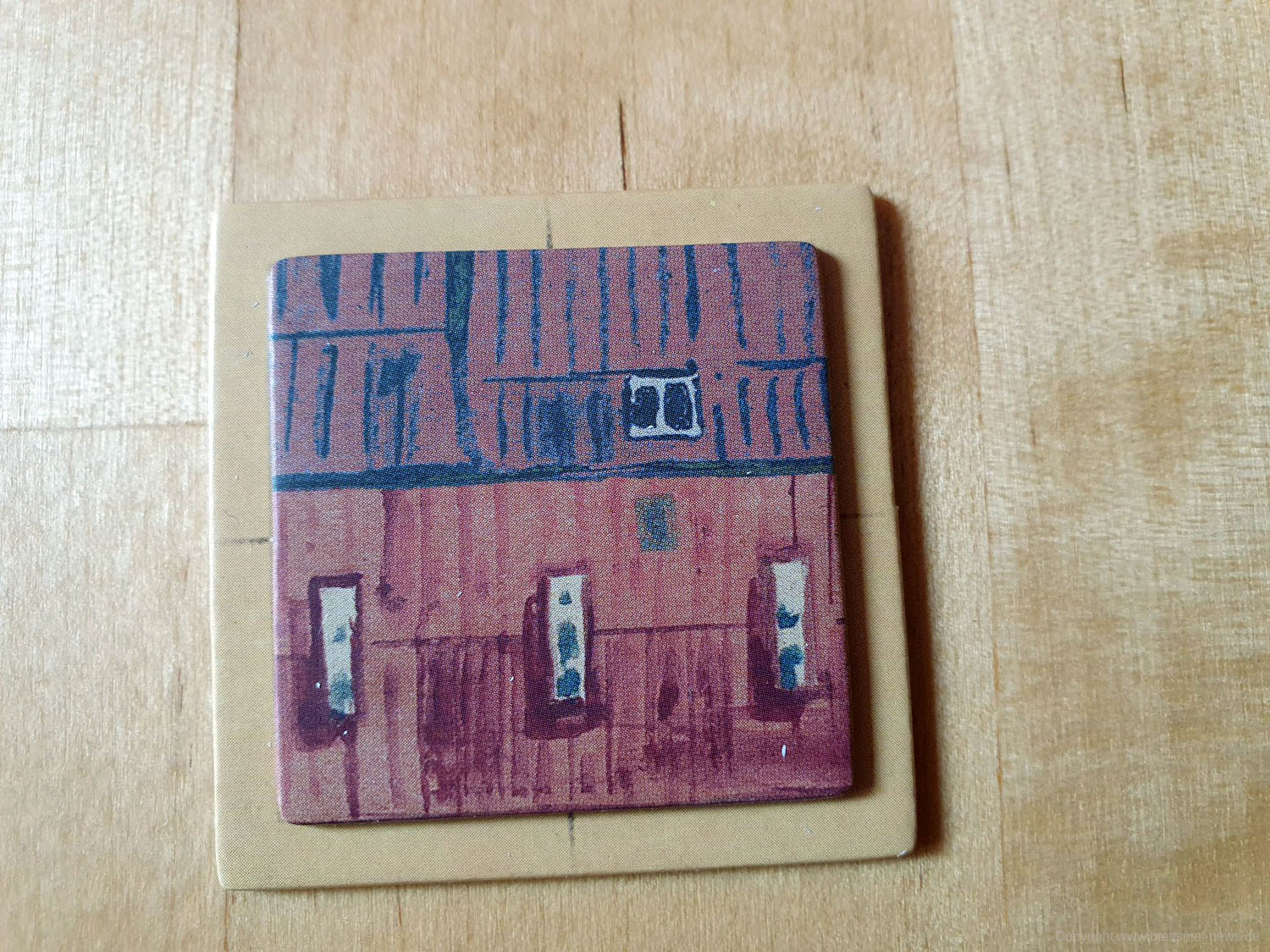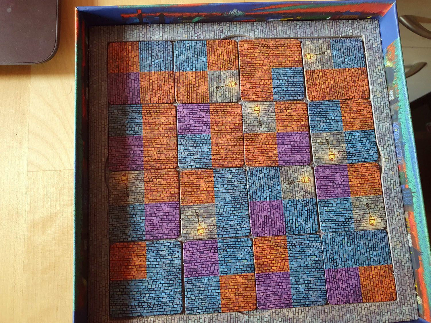 Dabei ist vor allem die Zweiteilung des Spielablaufs hervorzuheben. Im ersten Teil wird zunächst der Spielplan an sich zusammengepuzzelt. Und das auf dem Spielbrett, das sich platzsparender Weise im Boden des Spielkartons befindet. Bereits diese Spielphase ist taktisch sehr interessant, da immer wieder zwischen dem Legen eines Bodenplättchens und eines dafür passenden Gebäudeteils für die zweite Phase abgewogen werden muss. Lege ich zuerst mein passendes Bodenplättchen, könnte genau das dafür benötigte Gebäude vom Gegner weggeschnappt werden. Nehme ich zuerst das Gebäude, verbaut mir mein Gegenüber vielleicht den Grundriss. Das gegenseitige Verbauen und Vereiteln der Pläne beginnt bereits ab dem ersten Zug.