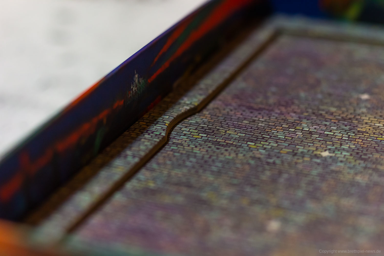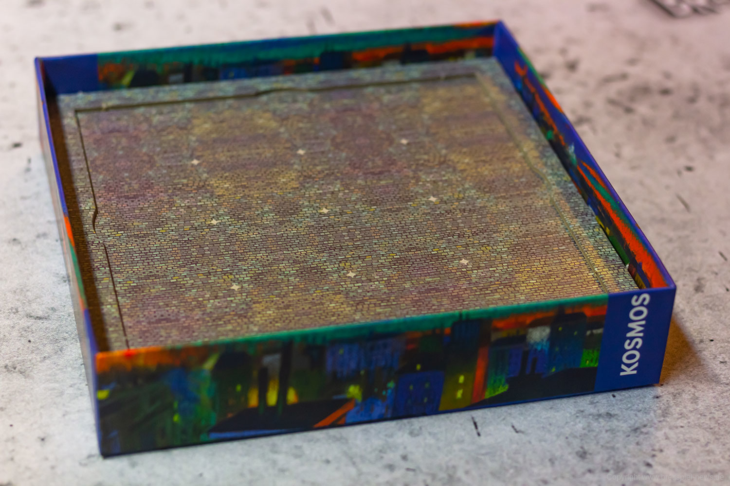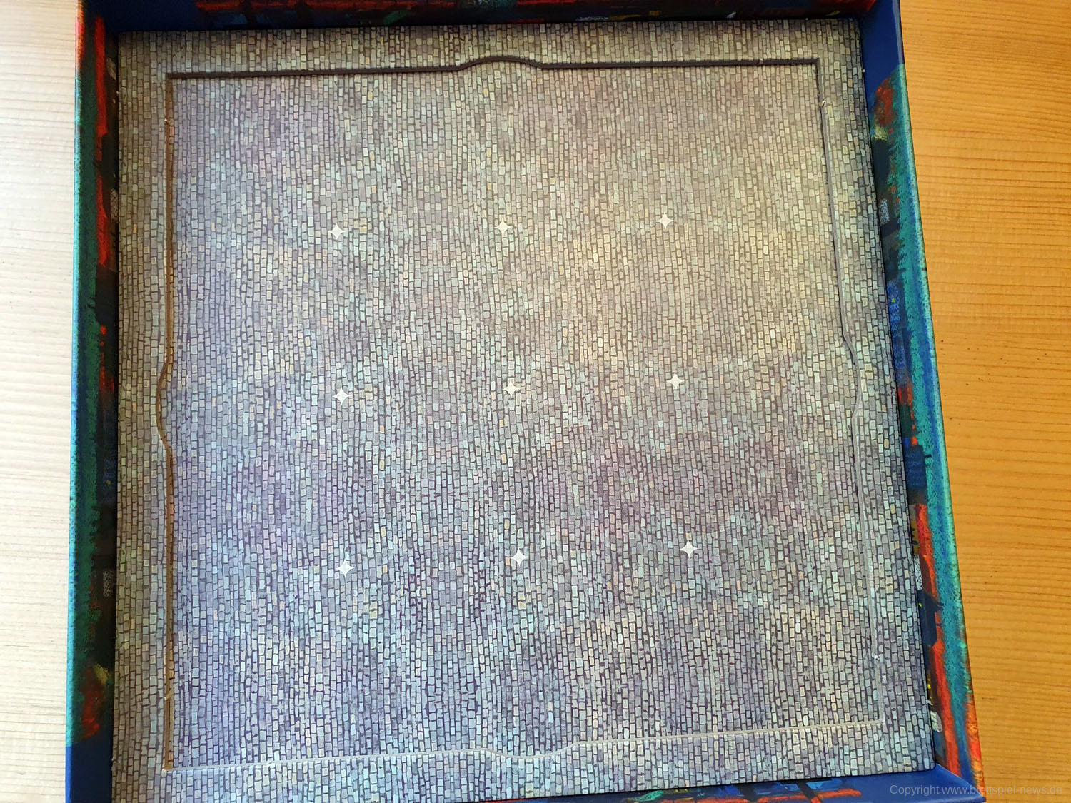 Dabei ist vor allem die Zweiteilung des Spielablaufs hervorzuheben. Im ersten Teil wird zunächst der Spielplan an sich zusammengepuzzelt. Und das auf dem Spielbrett, das sich platzsparender Weise im Boden des Spielkartons befindet. Bereits diese Spielphase ist taktisch sehr interessant, da immer wieder zwischen dem Legen eines Bodenplättchens und eines dafür passenden Gebäudeteils für die zweite Phase abgewogen werden muss. Lege ich zuerst mein passendes Bodenplättchen, könnte genau das dafür benötigte Gebäude vom Gegner weggeschnappt werden. Nehme ich zuerst das Gebäude, verbaut mir mein Gegenüber vielleicht den Grundriss. Das gegenseitige Verbauen und Vereiteln der Pläne beginnt bereits ab dem ersten Zug.