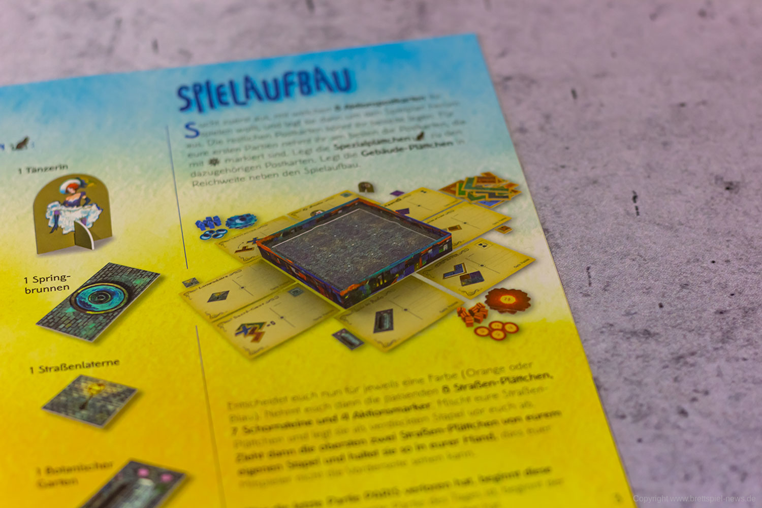 In der Schachtel befinden sich ein Spielbrett, Straßen- und Gebäudeplättchen, 12 Aktions-Postkarten und Marker in den beiden Spielerfarben. Das Spielmaterial insgesamt ist hochwertig, die Gebäude sind schön illustriert und enthalten liebevolle Einzeldarstellungen. Die Spielermarker sind aus Holz. Die Regeln in der Anleitung sind sehr gut erklärt und ermöglichen einen sofortigen Einstieg in das Spiel.