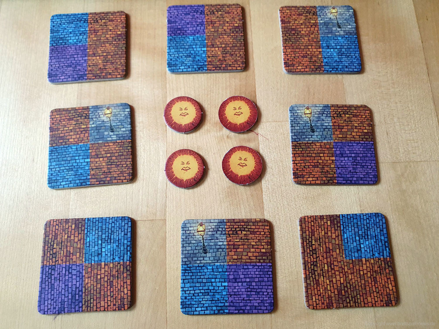 In diesem Zweispieler-Spiel erhalten beide Spieler acht Plättchen mit Stadtteilen sowie sieben Schornsteine in ihrer jeweiligen Spielerfarbe blau bzw. orange. Das Spielbrett, auf dem die Plättchen ausgelegt werden, ist gleichzeitig die Spieleschachtel.