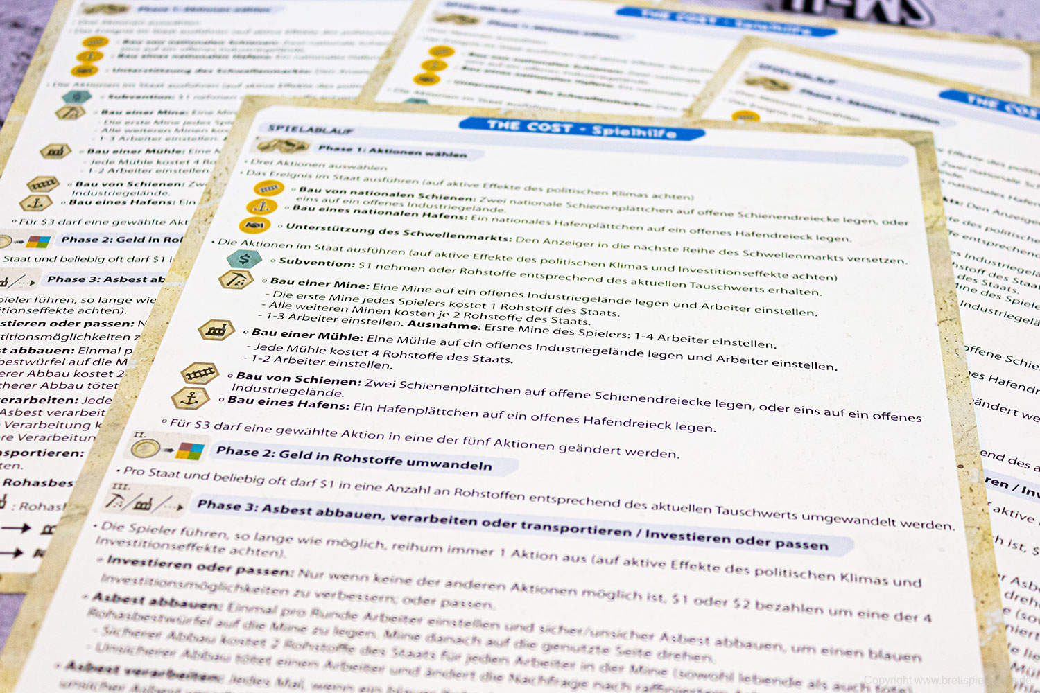 Wer ein Spiel um solch ein schwieriges Thema entwickelt, der möchte nicht nur Spielspaß vermitteln, sondern aufmerksam machen. Bemerkenswert ist die Art und Weise, wie in THE COST der moralische Konflikt thematisiert wird. Ganz nüchtern werden die Fakten und Hintergrundinformationen in der Anleitung vermittelt. Nirgends wird mahnend ein Finger gehoben.