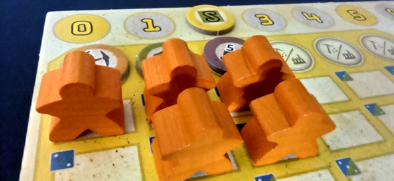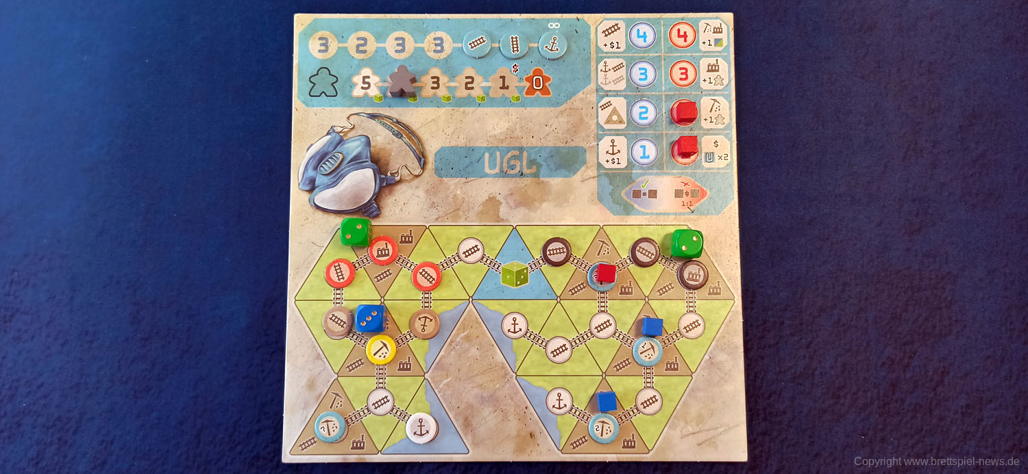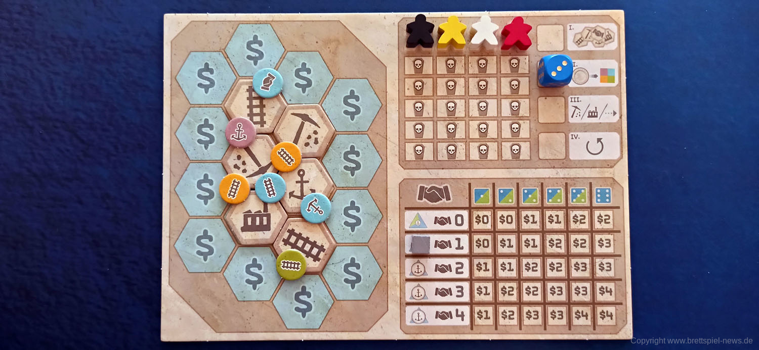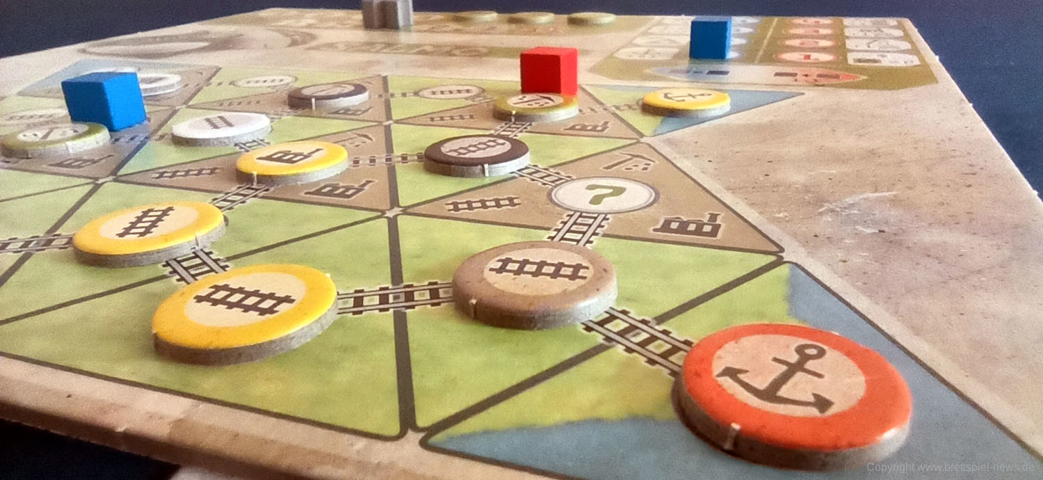 Sehr innovativ ist auch die Auswahl der Aktionen durch das Besetzen eines Eckpunkts dreier Felder. Allein dieser Schritt Bedarf einer guten Planung und kann schnell einem Gegner einen Strich durch die Rechnung machen, z.B. wenn die letzte Hafenbau-Aktion weggeschnappt wird.