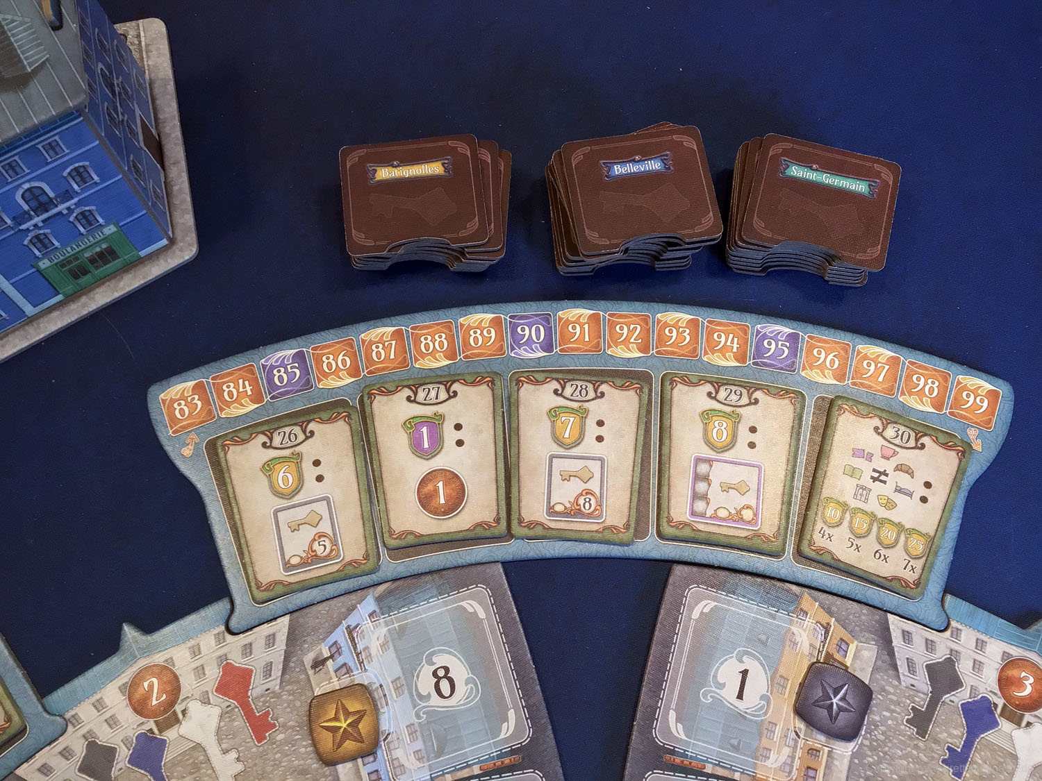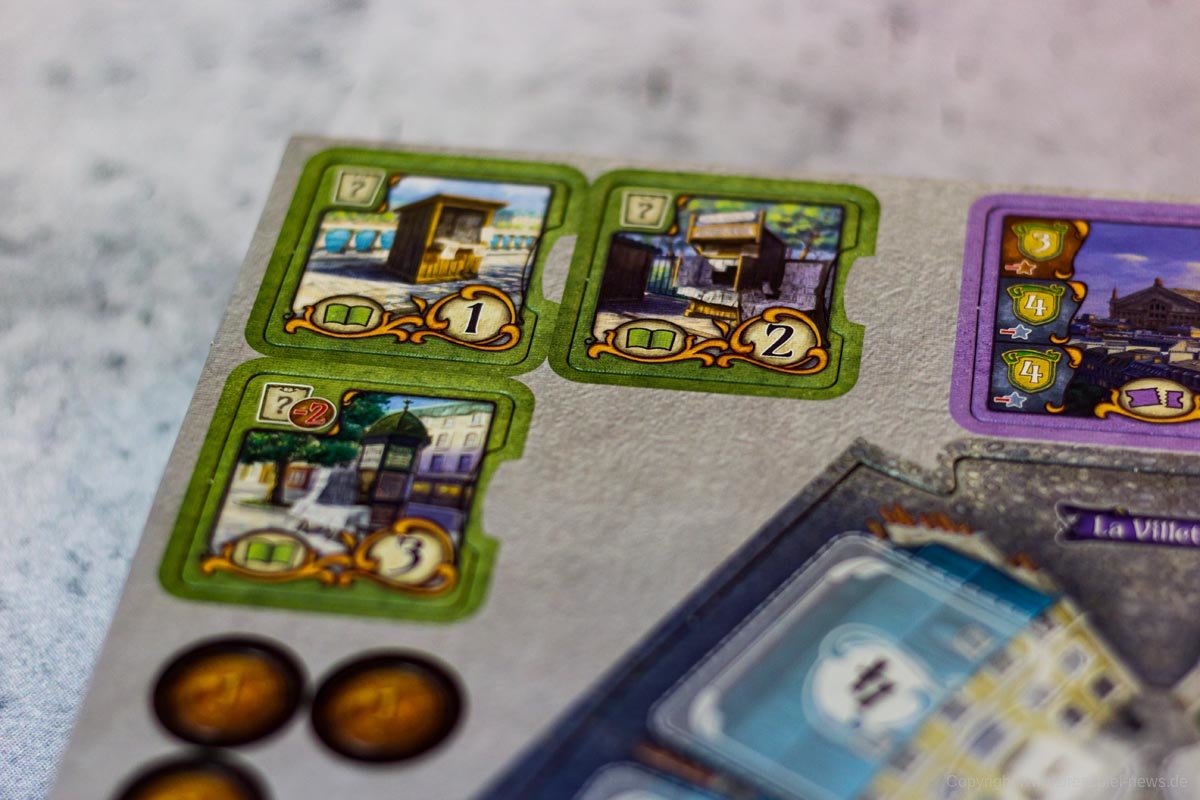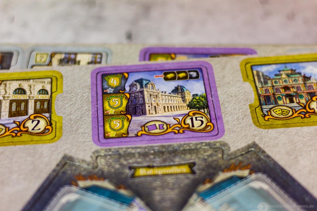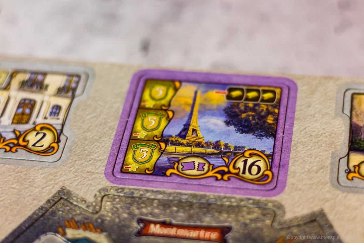 Der zusammenpuzzlebare Spielplan von PARIS lässt ein modulares und immer wieder veränderbares Setting vermuten, was leider nicht der Fall ist. Alle Teile haben ihren festgelegten Platz, der Aufbau der Bezirke und der Bonusplättchen ist immer gleich. Gerade bei den Bonusplättchen könnte der Wiederspielreiz durch eine veränderbare Auslage erhöht werden. Abwechslungsreich machen das Spiel nur die zufällig angeordneten Ressourcenplättchen und der gemischte Stapel Gebäudeplättchen. Das Ziehen dieser Gebäudeplättchen stellt dabei den deutlichsten Glücksfaktor dar. Denn zu Beginn warten die Spieler vor allem auf die Gebäude mit den Werten eins bis drei, weil nur dadurch ein Zugriff auf die spielentscheidenden Bonusplättchen möglich ist.