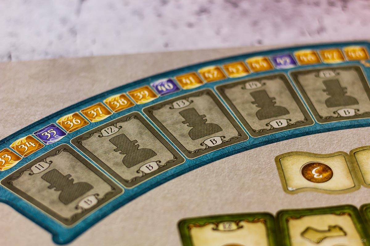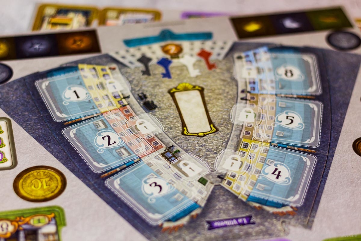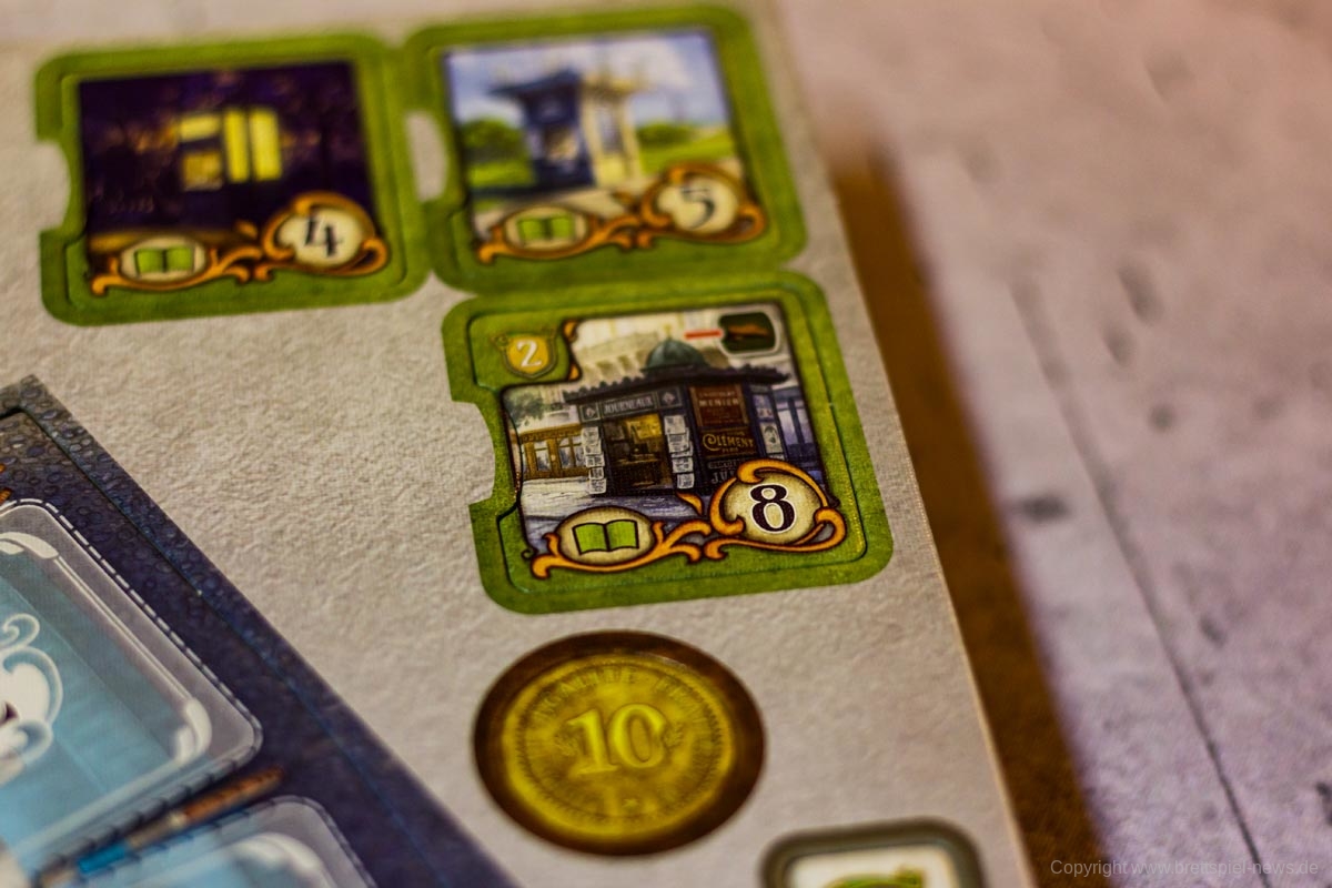 Wer als Erster die begehrten Gebäude zieht und den Schlüssel setzt, kann sich dadurch auf jeden Fall einen Vorsprung sichern. Durch den Aufdruck auf der Rückseite der Gebäudeplättchen, von denen stets drei wählbar sind, ist wenigstens der ausbaubare Bezirk bedingt steuerbar.