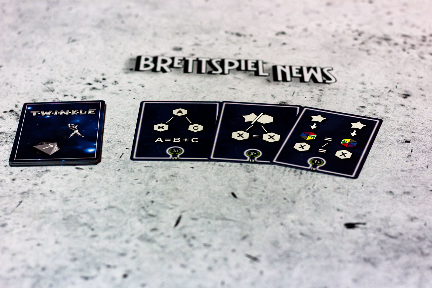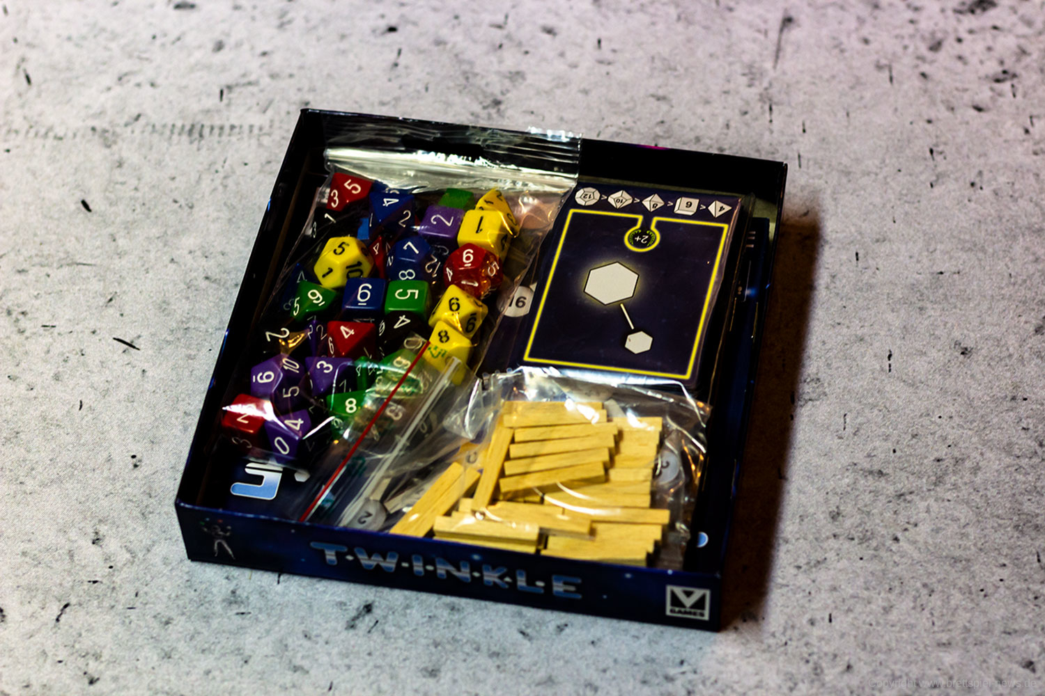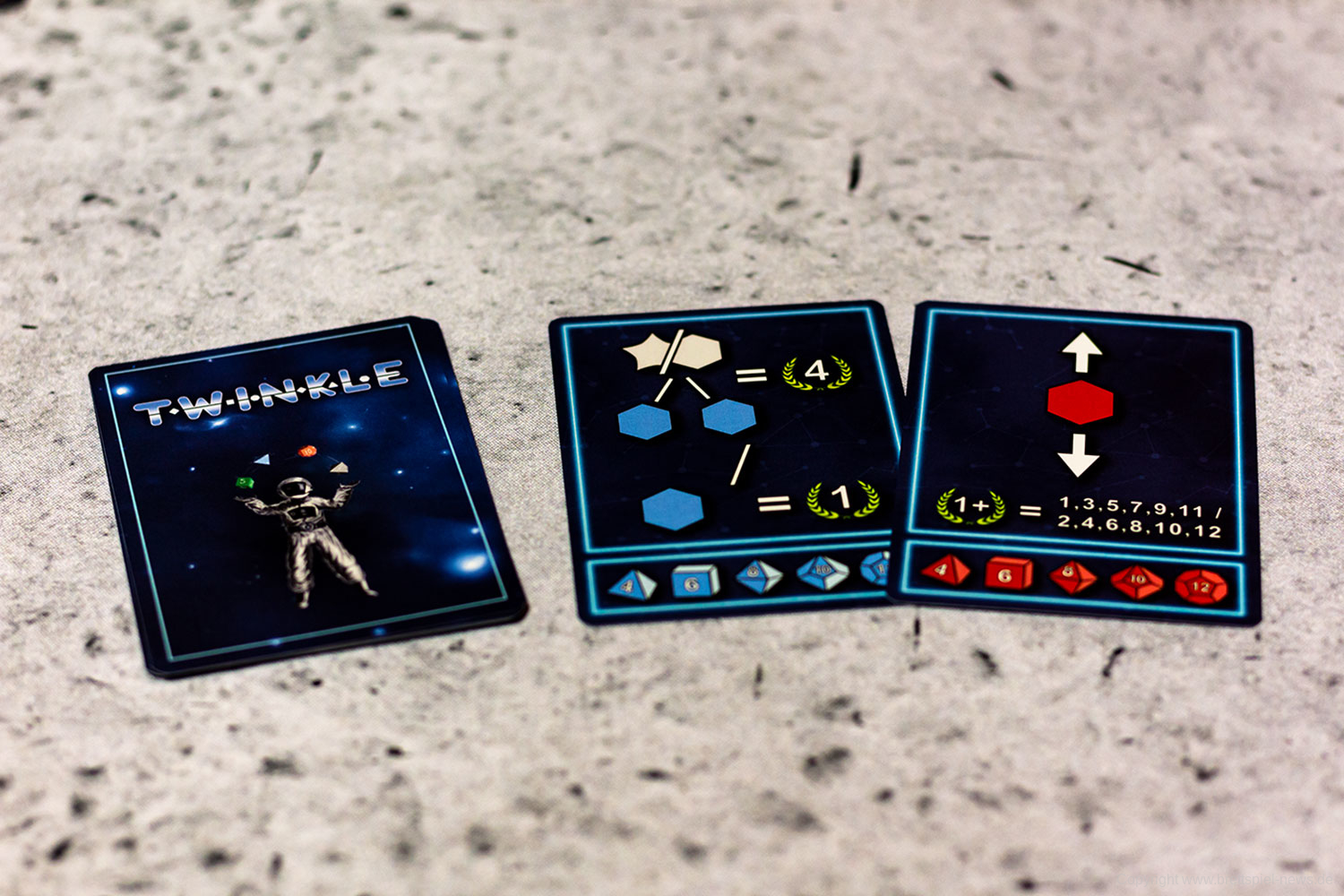 Bei TWINKLE versuchen die Spieler ein Sternenbild aus Würfeln zu formen, indem sie diese anhand ihrer Ergebnisse aneinanderreihen. Auch wenn das im ersten Moment etwas verschachtelt klingt, ist es in der Praxis denkbar einfach. Der aktive Spieler wählt dazu 3 Würfel seiner Wahl aus einer Auswahl verschiedener Würfelarten und Würfelfarben und würfeln diese. Anschließend wählt der Spieler einen dieser so gewürfelten Würfel aus und verbindet sie entweder mit seinem Startstern oder mit einem anderen Würfel, dessen Ergebnis höher ist als das Ergebnis des neuen Würfels. Möchte ein Spieler auf Nummer sicher gehen, kann er einen achtseitigen Würfel aus der Mitte des Spielfeldes wählen, die zu Beginn des Spiels gewürfelt worden sind. Diese Würfel werden mit ihrem so erwürfelten Ergebnis übernommen, was in Notsituationen eine helfende Hand darstellen kann. Der Clou an der Sache ist, dass es verschiedene Aufgaben zu erfüllen gilt, um Punkte zu sammeln. Zusätzlich stehen den Spielern in jedem Spiel lediglich 7 Aktionen zur Verfügung, womit jede Aktion gut durchdacht sein sollte.