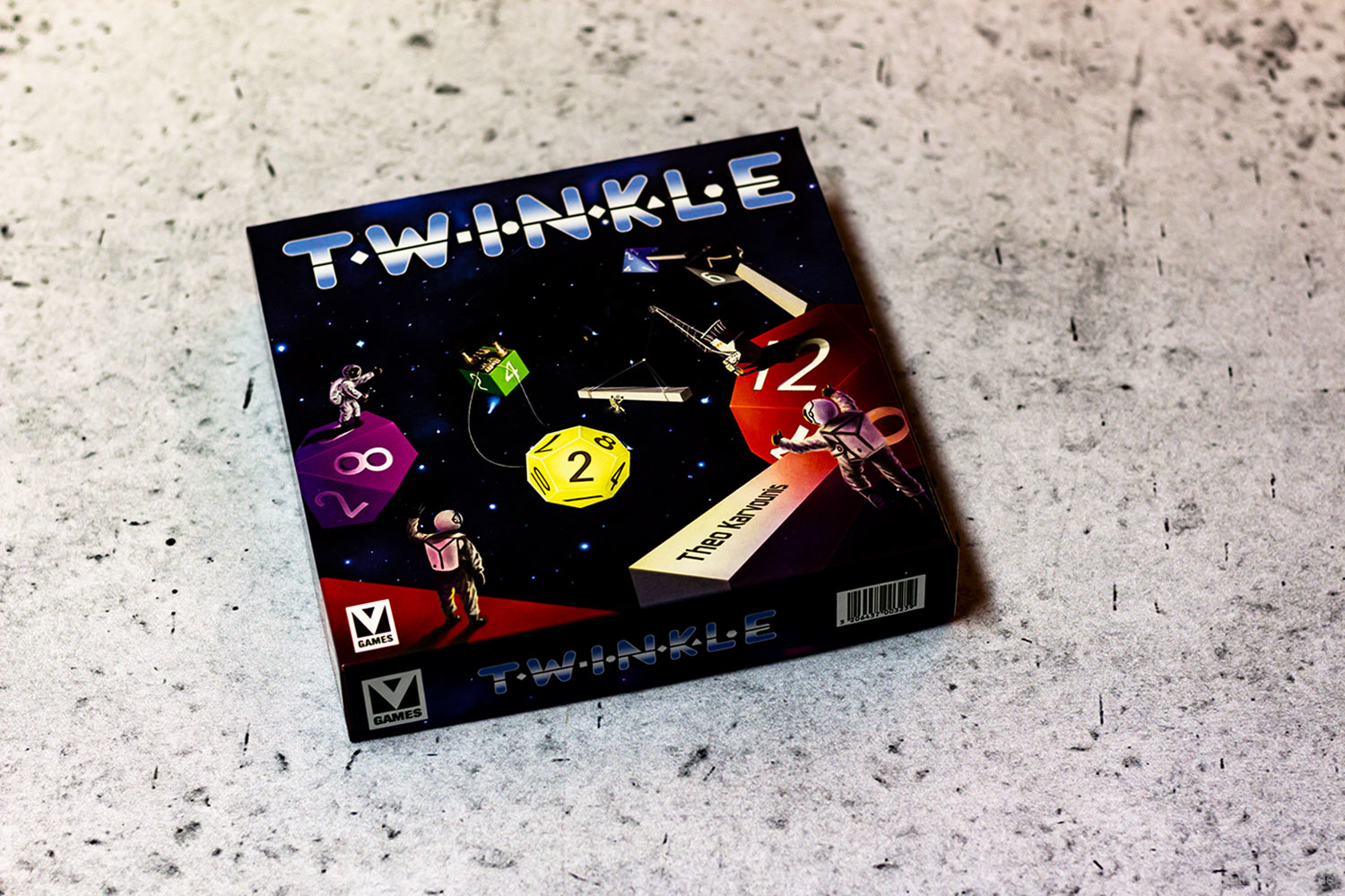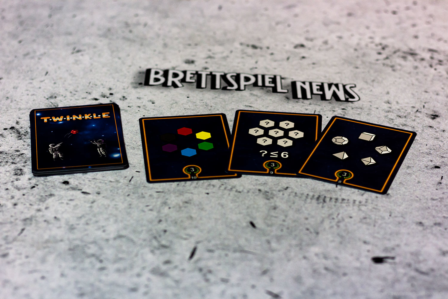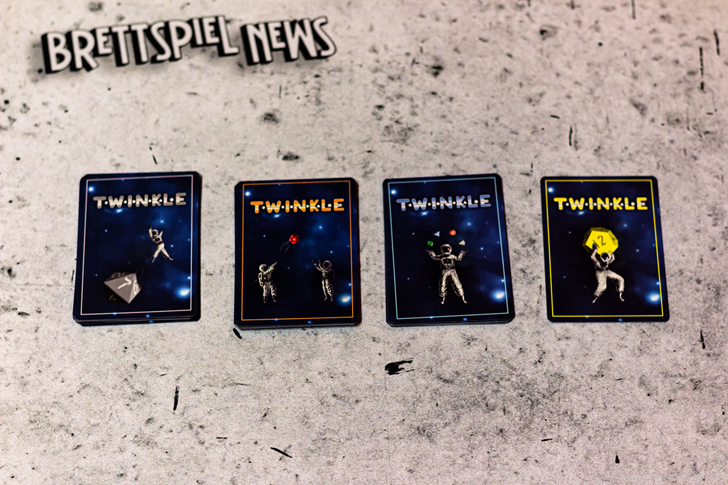 Bei TWINKLE versuchen die Spieler ein Sternenbild aus Würfeln zu formen, indem sie diese anhand ihrer Ergebnisse aneinanderreihen. Auch wenn das im ersten Moment etwas verschachtelt klingt, ist es in der Praxis denkbar einfach. Der aktive Spieler wählt dazu 3 Würfel seiner Wahl aus einer Auswahl verschiedener Würfelarten und Würfelfarben und würfeln diese. Anschließend wählt der Spieler einen dieser so gewürfelten Würfel aus und verbindet sie entweder mit seinem Startstern oder mit einem anderen Würfel, dessen Ergebnis höher ist als das Ergebnis des neuen Würfels. Möchte ein Spieler auf Nummer sicher gehen, kann er einen achtseitigen Würfel aus der Mitte des Spielfeldes wählen, die zu Beginn des Spiels gewürfelt worden sind. Diese Würfel werden mit ihrem so erwürfelten Ergebnis übernommen, was in Notsituationen eine helfende Hand darstellen kann. Der Clou an der Sache ist, dass es verschiedene Aufgaben zu erfüllen gilt, um Punkte zu sammeln. Zusätzlich stehen den Spielern in jedem Spiel lediglich 7 Aktionen zur Verfügung, womit jede Aktion gut durchdacht sein sollte.