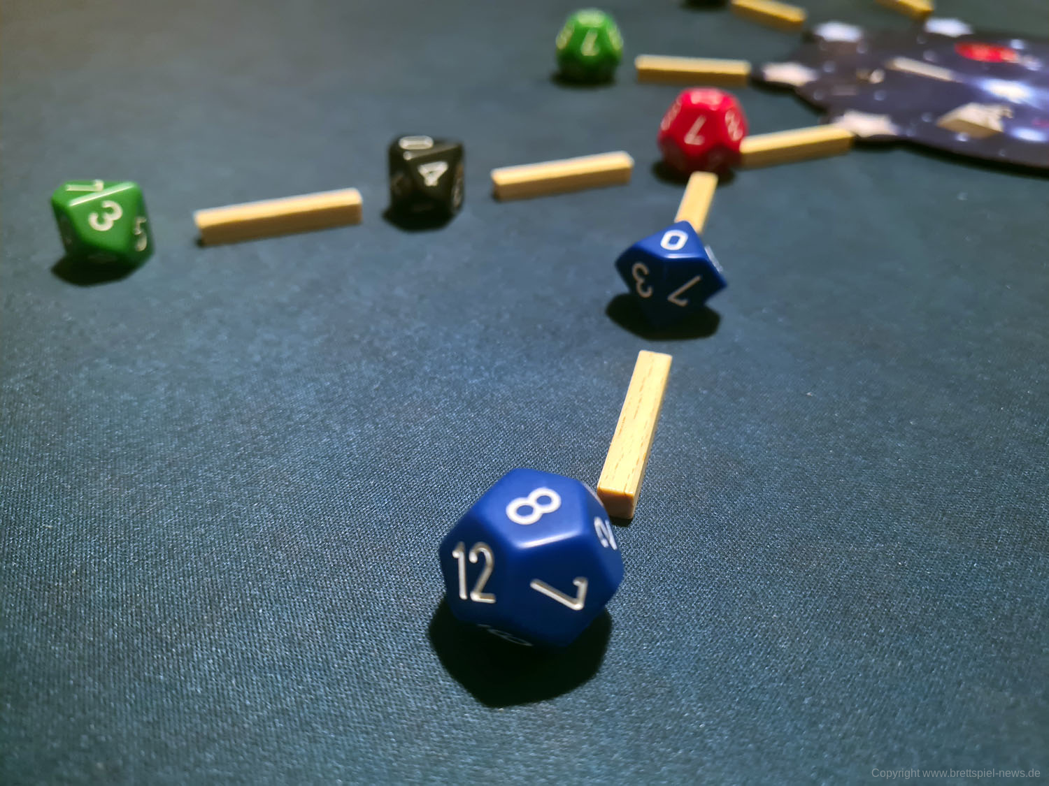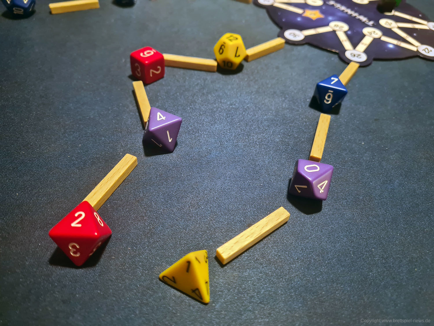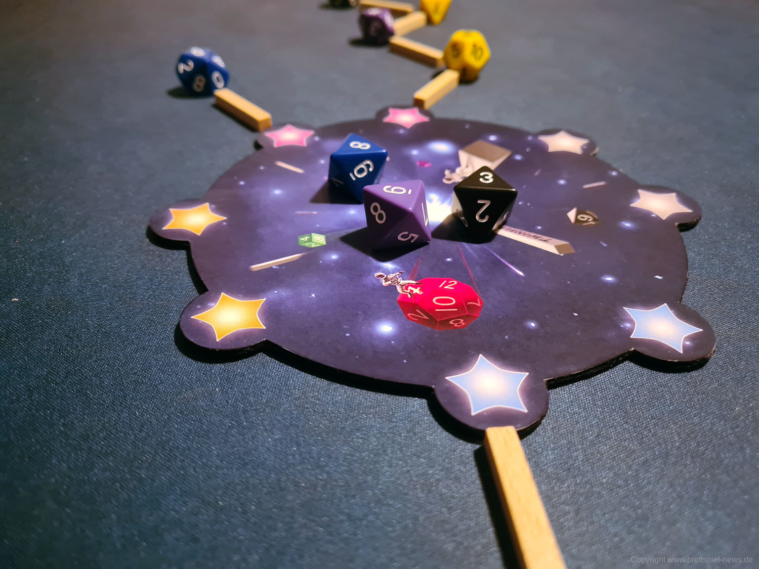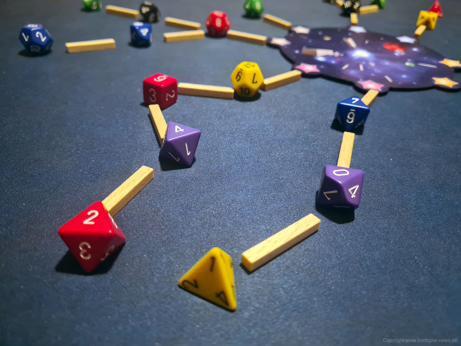 Unabhängig von der Farbe erhalten Spieler zusätzlich 2 Punkte für jeden Würfel einer größeren „Würfelart“, der mit einer niedrigeren Zahl an eine kleinere Würfelart angebunden wird. Hat ein Spieler also einen sechsseitigen Würfel mit der Zahl 6, an den ein zwölfseitiger Würfel mit der Zahl 2 angrenzt, erhält er für diesen Würfel 2 Punkte. Das Spiel erklärt es damit, dass dieser „Stern“ heller scheint als andere, wenn er neben schwächeren Sternen aufgehängt wird, was ein nettes Detail ist.