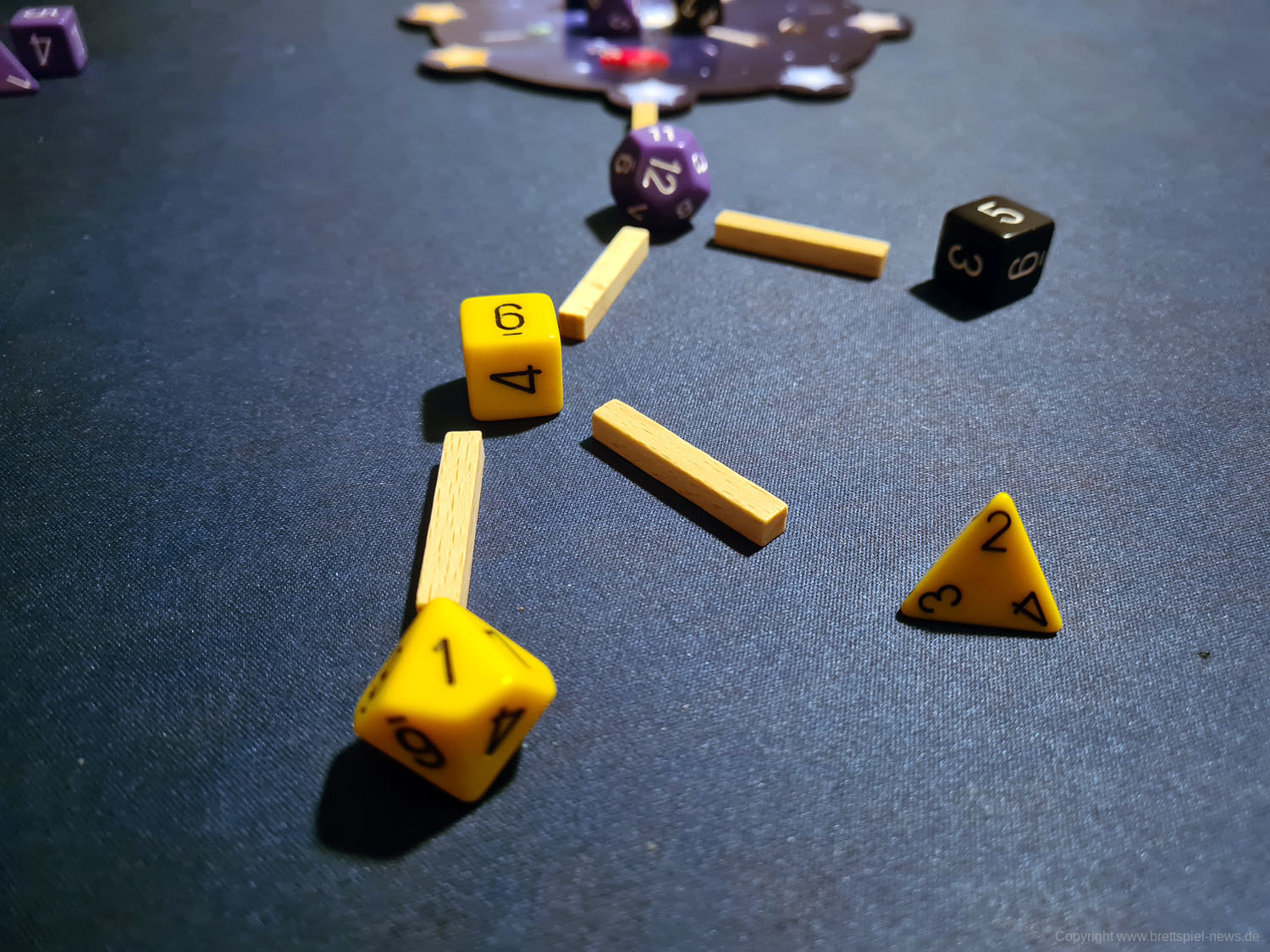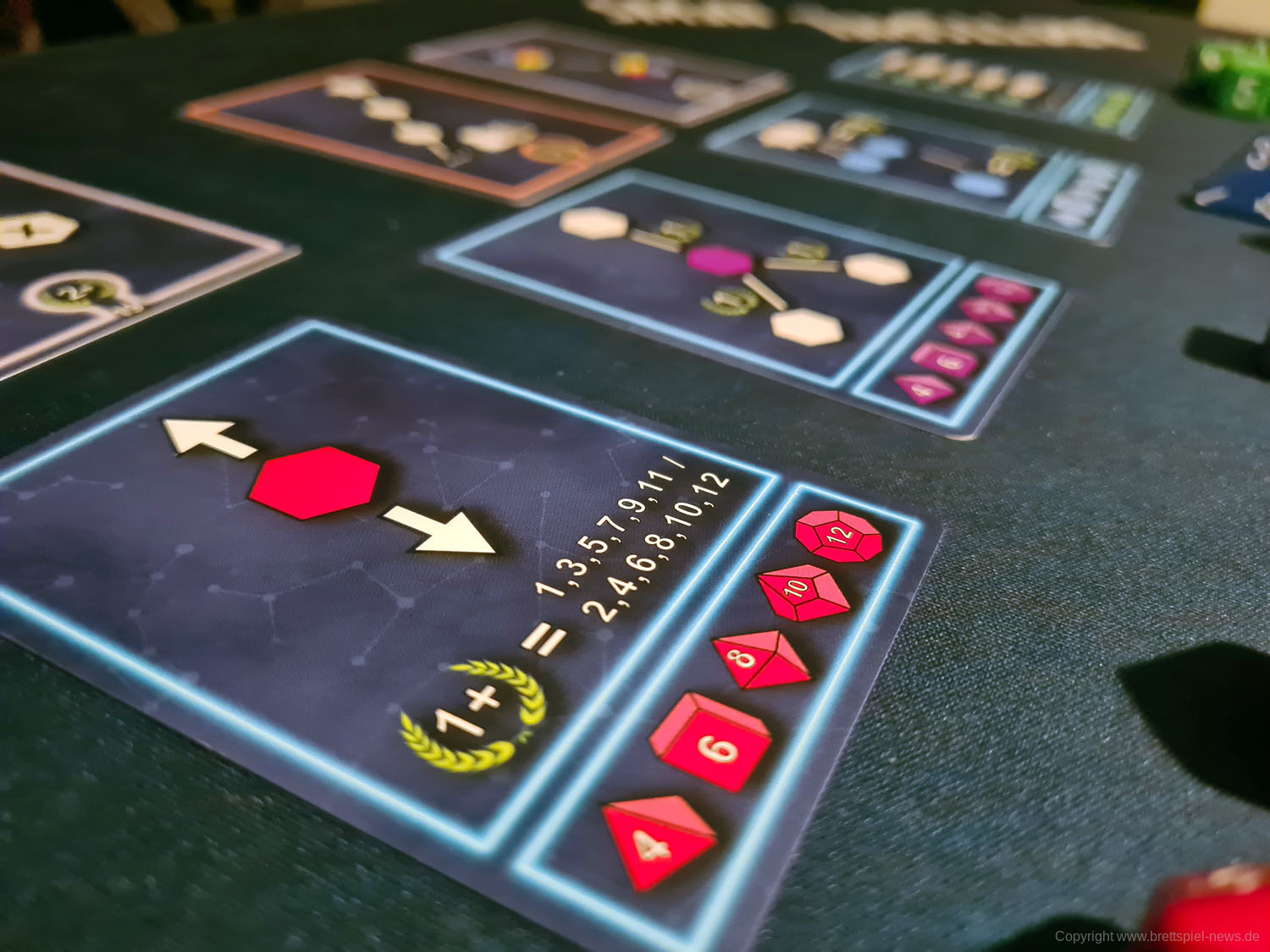 Je nach Spielerzahl erhöhen sich die Würfelanzahl und damit einhergehend auch die Aufgabentypen für diese Würfel. Generell sind die Aufgaben sehr gut mit eigenen Symbolen erklärt. Jedoch wird es bei einem 4-Spieler-Spiel sehr schnell unübersichtlich, sodass unerfahrene Spieler schnell mit der Anzahl unterschiedlicher Aufgaben, die sie zeitgleich zu erfüllen haben, überfordert sind. Ein anderes Bild zeigt sich bei einem 2-Spieler- und zum Teil auch bei einem 3-Spieler-Spiel. Hier sind die Aufgaben nicht alle zeitgleich auf dem Feld, da bei einem 2-Spieler-Spiel nur 4 der 6 Karten aufgedeckt werden und bei einem 3-Spieler-Spiel 5 von 6 Karten ins Spiel kommen. Das ermöglicht eine gewisse Variation, die bei einem 4-Spieler-Spiel abhandenkommt. Erfahrene Spieler können natürlich schnell auch im 4-Spieler-Spiel starten, für Anfänger ist das aber eher nichts.