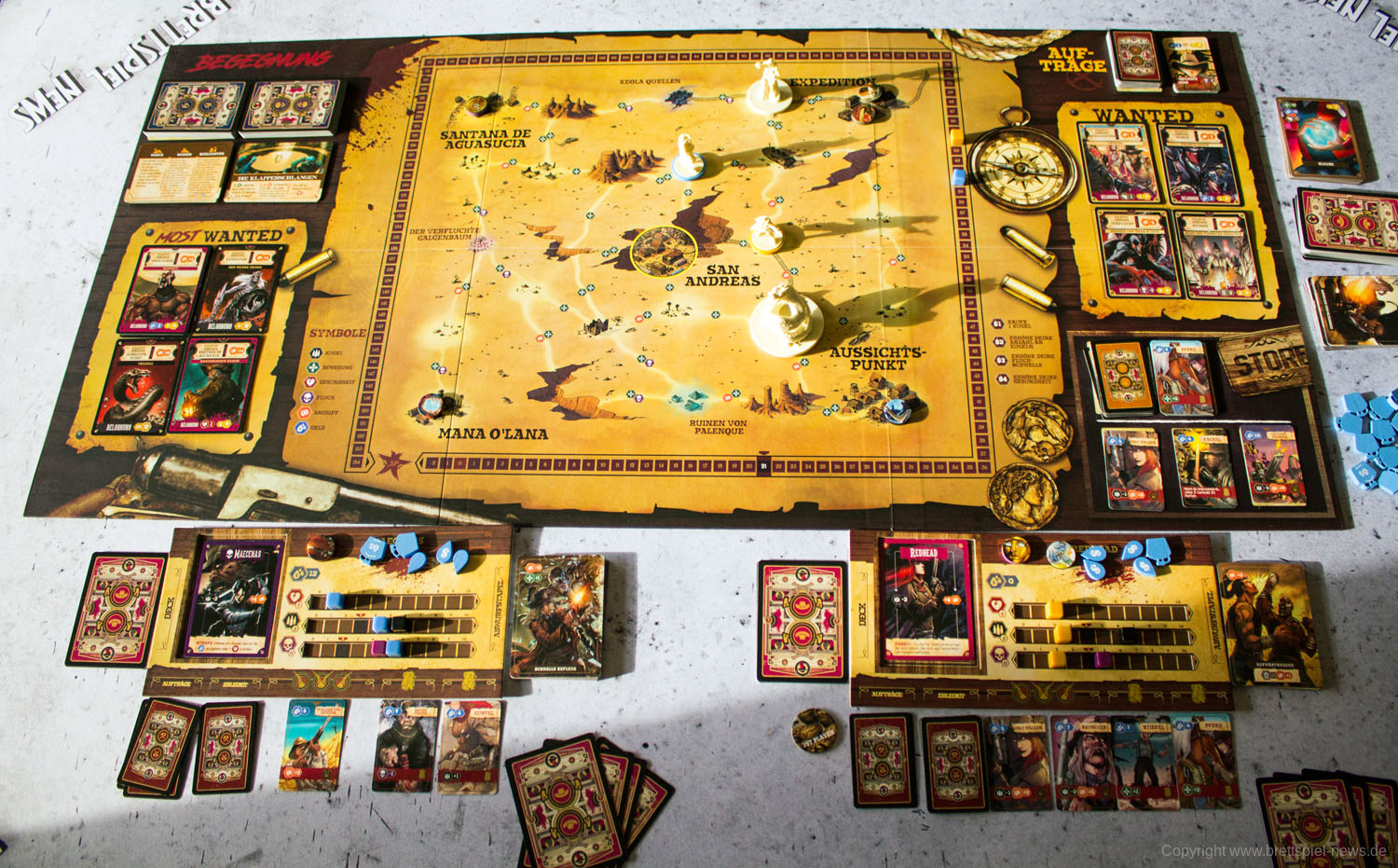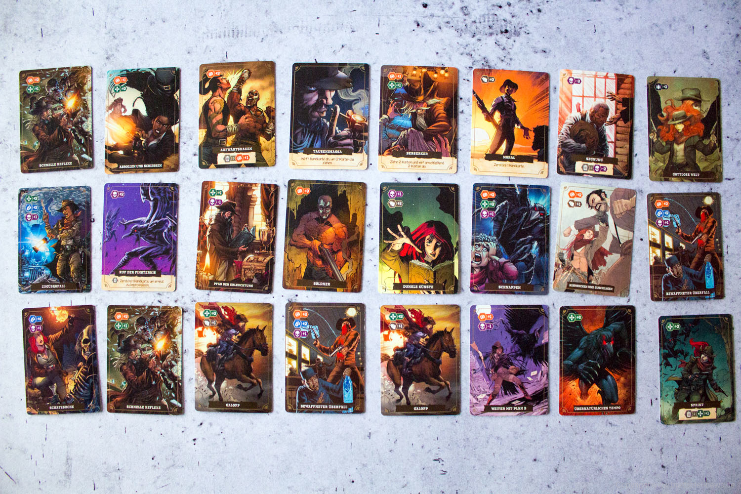Bei der Mechanik gefällt mir vor allem der Deckbauaspekt und hier vor allem das Improvisieren, bei dem zu Beginn 2 Karten vom allgemeinen Stapel gezogen und die ausgewählte Karte direkt auf die Hand genommen werden kann. Es hat auch Bedeutung, den Deckbau nicht auf die leichte Schulter zu nehmen, da es ansonsten nicht für die Bewegung zu den abgelegenen Orten reicht oder größere Gegner unbesiegbar werden. Das Kaufen von Ausrüstung oder Fähigkeiten ist ebenfalls ein wichtiger Aspekt. Wer versucht, allein mit den Grundwerten durchzukommen, könnte vor allem bei der Munition und dem Fluchlevel schnell an Grenzen stoßen. Ein Pferd oder eine Gatling Gun können bei Bewegung oder Kampf einen großen Unterschied ausmachen. Ein Steuern des Fluchlevels hat ebenfalls Vorteile. In der Regel wird der eigene Charakter dadurch stärker, muss aber auch regelmäßig dafür zahlen, sei es mit Lebenspunkten oder Ressourcen.