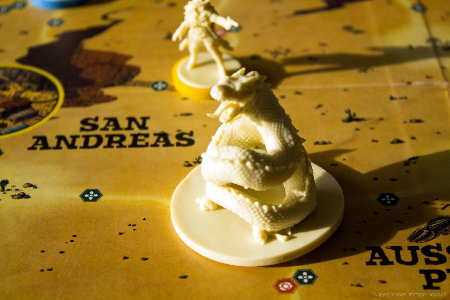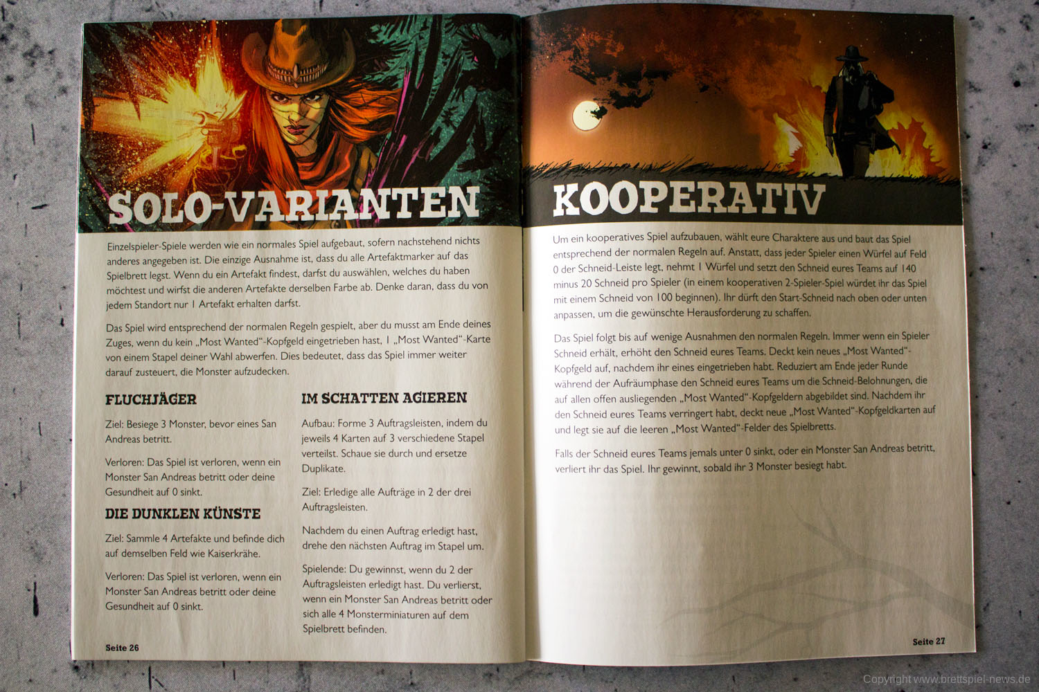 Der erste Blick auf das Spielmaterial hat meine Erwartungen erfüllen können. Die Spielerboards sind sehr gut auf das Spiel abgestimmt, das Design von Spielbrett und Karten lässt die fantasievollen Charaktere des Endzeit Wilden Westens glänzen und selbst die Spielanleitung im Comicformat und mit artgerechten 32 Seiten passt sich wunderbar in das Thema ein. Ein paar Punkte Abzug gibt es bei den Miniaturen. Diese waren zum Teil sehr stark verbogen und zudem war eine der Monsterminiaturen doppelt in der Box, dafür fehlte eine andere komplett. Ein Umstand, den ich aber verzeihen kann. Mit einem Heiß-/Kaltbad lassen sich die Miniaturen wiederaufrichten und fehlende Miniaturen lassen sich in der Regel problemlos bei GRIMSPIRE ordern.