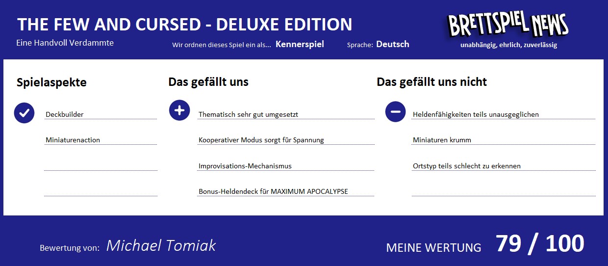 Wie sieht es also aus? Kann THE FEW AND CURSED meinen Erwartungen gerecht werden? Ein klares Ja ist die Antwort. Mich hat auch dieser Mike-Gnade-Titel wieder überzeugen können. Genauso wie MAXIMUM APOCALYPSE entführt er die Spieler in eine sehr gut präsentierte B-Movie- Endzeit-Comic-Welt, die hier perfekt mit dem Wilden-Westen-Thema harmoniert. Spielerisch hat THE FEW AND CURSED durchaus Abwechslung zu bieten, ohne dabei jedoch zu komplex zu werden. Die Anforderungen dürften sich im Bereich etwas höher angesetzter Kennerspiele bewegen und auch nicht ganz so bewanderte Brettspieler dürften dadurch nicht vor unlösbare Aufgaben gestellt werden. Ich kann nur empfehlen, auf jeden Fall einmal einen näheren Blick zu wagen. Und meine zweite Empfehlung ist, auf jeden Fall den optionalen kooperativen Modus einmal zu testen. Mir hat dieser, wie gesagt, deutlich mehr Freude gemacht, als die Siegpunktvariante.
