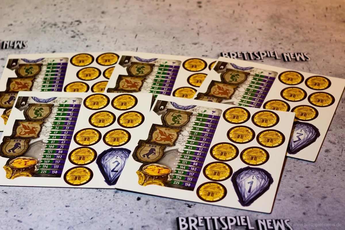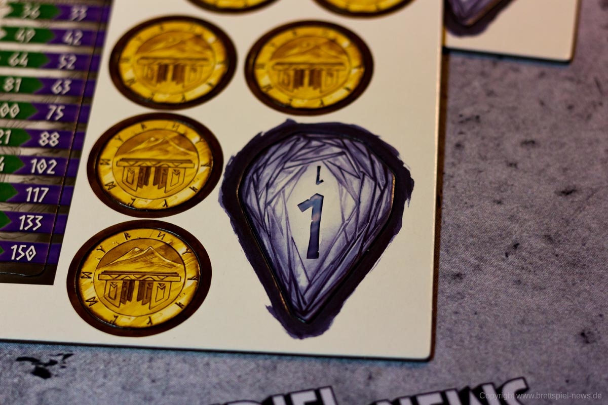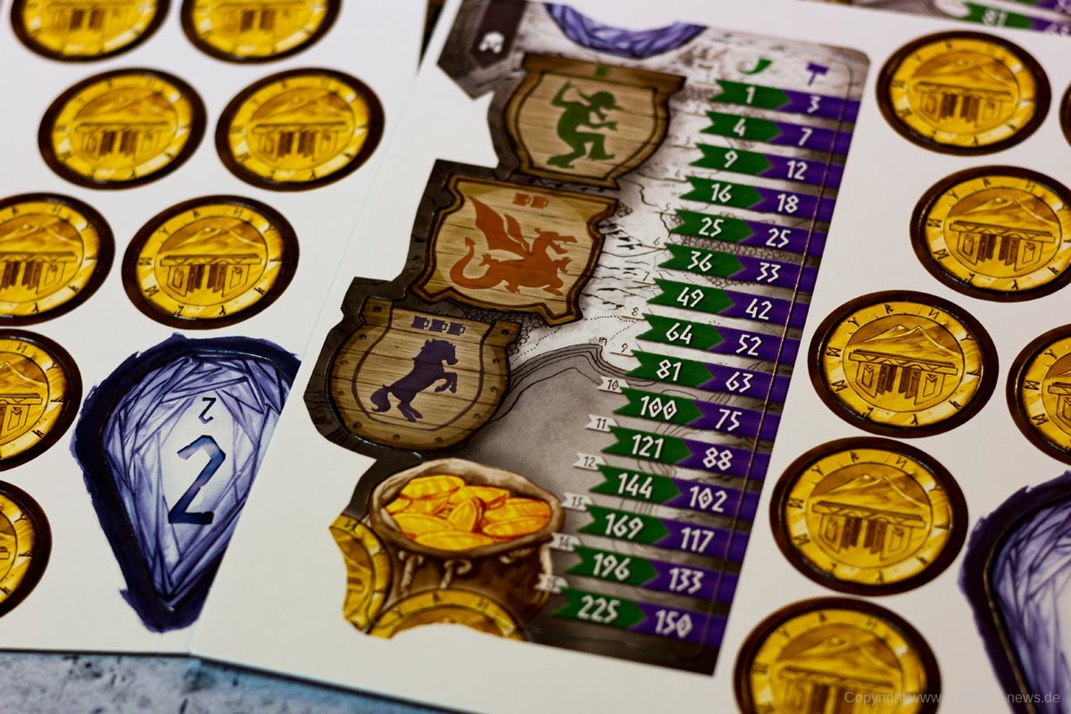 Ein großer Knackpunkt des Spiels war für mich aber die fehlende Thematik. Ja, die Spieler bieten Gold, damit sie schnell einen von ihnen gewünschten Zwerg auswählen können und die Zwerge sehen auch niedlich aus, aber genau das wäre für jedes nur erdenkliche Szenario möglich. Die Geschichte des Spiels wird in 8 kurzen Sätzen angeschnitten, wobei die Namen der großen drei Tavernen nur einmalig im Fließtext der Regelerklärung genannt werden. Auch, dass die Münzen nur dargeboten werden und nicht für das Anheuern der Zwerge ausgegeben werden, kam uns vor diesem Hintergrund etwas komisch vor. Während diese Aspekte für viele Spieler nebensächlich sind, stört es die Atmosphäre des Spiels doch sehr. Mit ein wenig mehr Hintergrundinformationen und „Worldbuilding“ hätte NIDAVELLIR hier sehr einfach Pluspunkte sammeln können, nun ist es aber etwas verschenktes Potential.