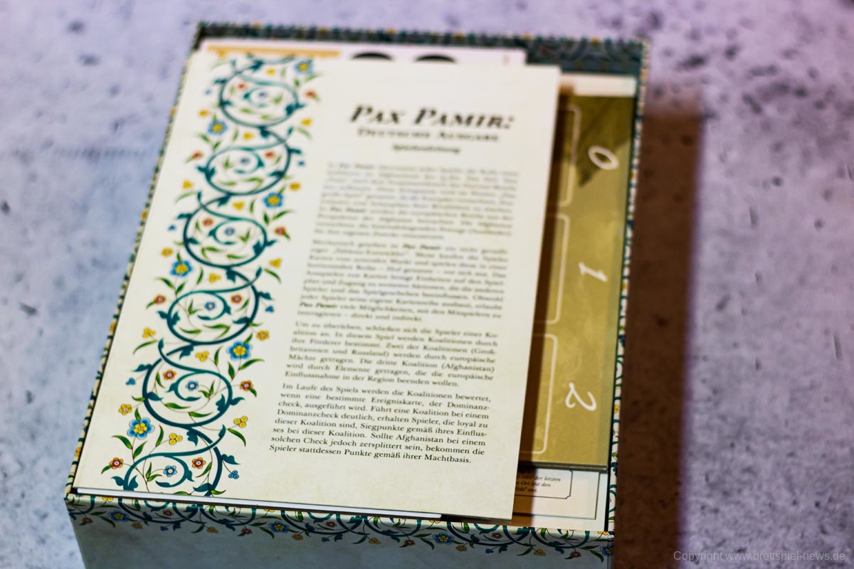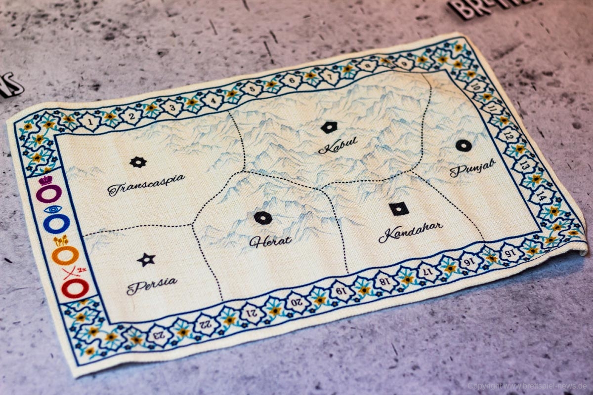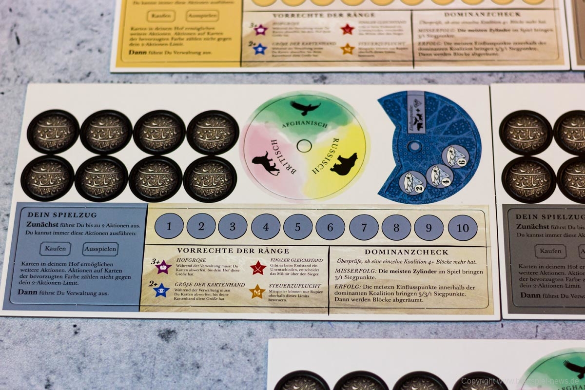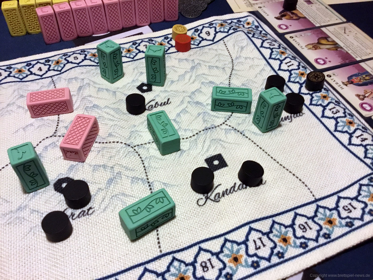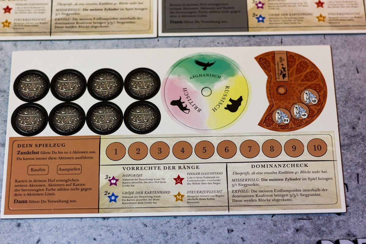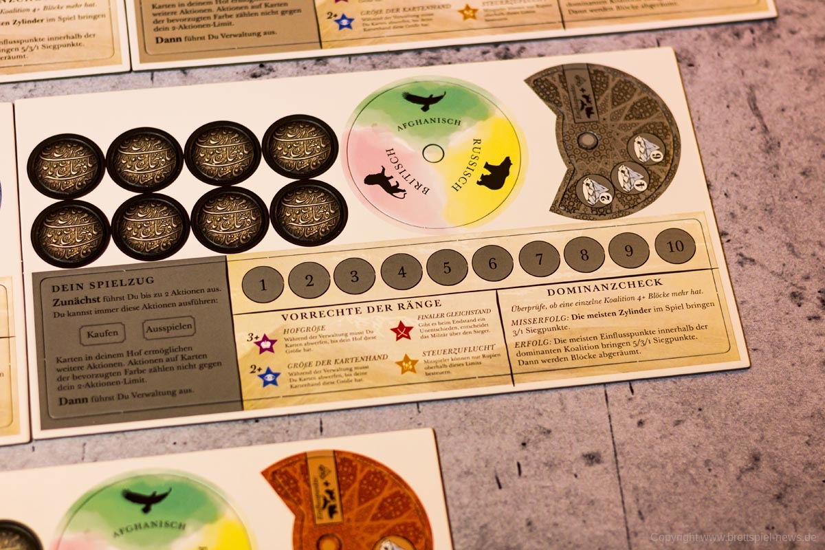 PAX PAMIR greift tief in die Komponentenkiste und zeigt eine Fülle an verschiedenen Materialien und Farben. Die Rückseite des Marktbretts kann als Landkarte genutzt werden, sollte der Stoffplan nicht den eigenen Geschmack treffen. Die Resinblöcke in Pastellfarben heben sich angenehm vom Spielbrett ab und ermöglichen einen schnellen Überblick über die Machtverhältnisse in Afghanistan. Durch die Farbgebung wirken sie gleichzeitig erfrischend „leicht“. Die hölzernen Zylinder und Herrschaftsscheiben passen gut in das Gesamtbild und sind ebenfalls tadellos gefertigt. Die Kartenqualität ist gut und auch die Pappmünzen sind gut verklebt. Die vorliegende Version des Spiels wurde mit optional erhältlichen Metallmünzen aufgewertet, die mit ihren Eigenheiten angenehm zum Spielgefühl beitragen. Die großformatigen Spielerhilfen erleichtern das Spiel enorm, auch wenn in der Kurzfassung der Geschenkaktion ein kleiner aber gravierender Fehler enthalten ist. Ein Inlay hält alle Komponenten im passgenauen Karton an Ort und Stelle.